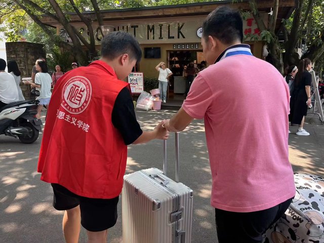 (图为志愿者为新生搬运行李)