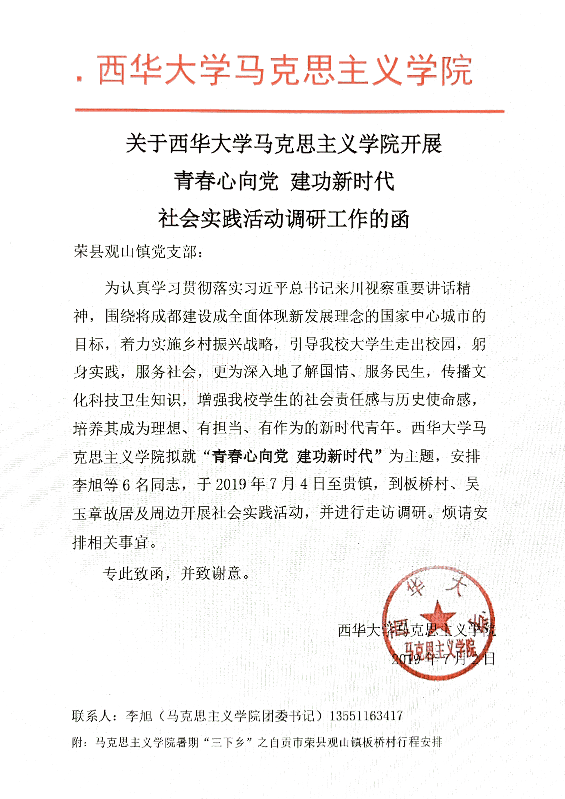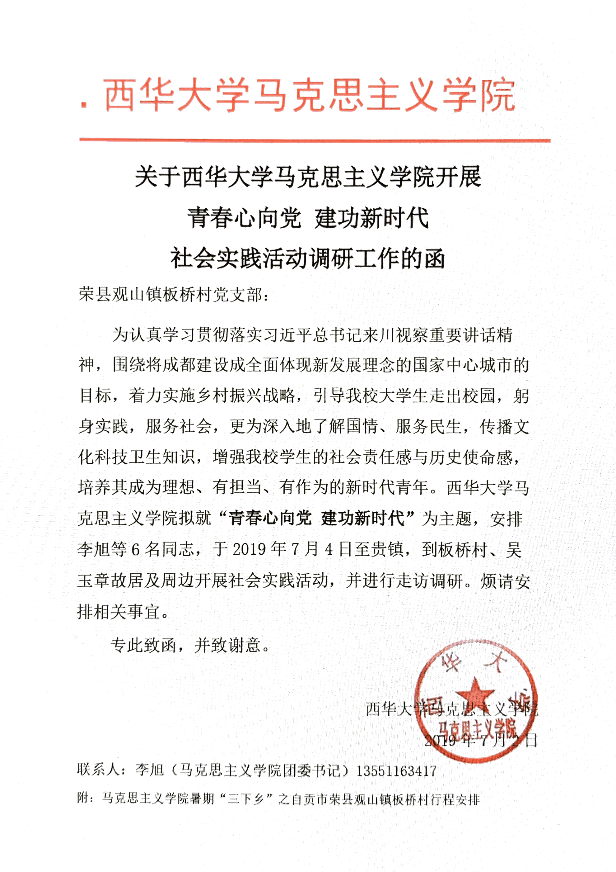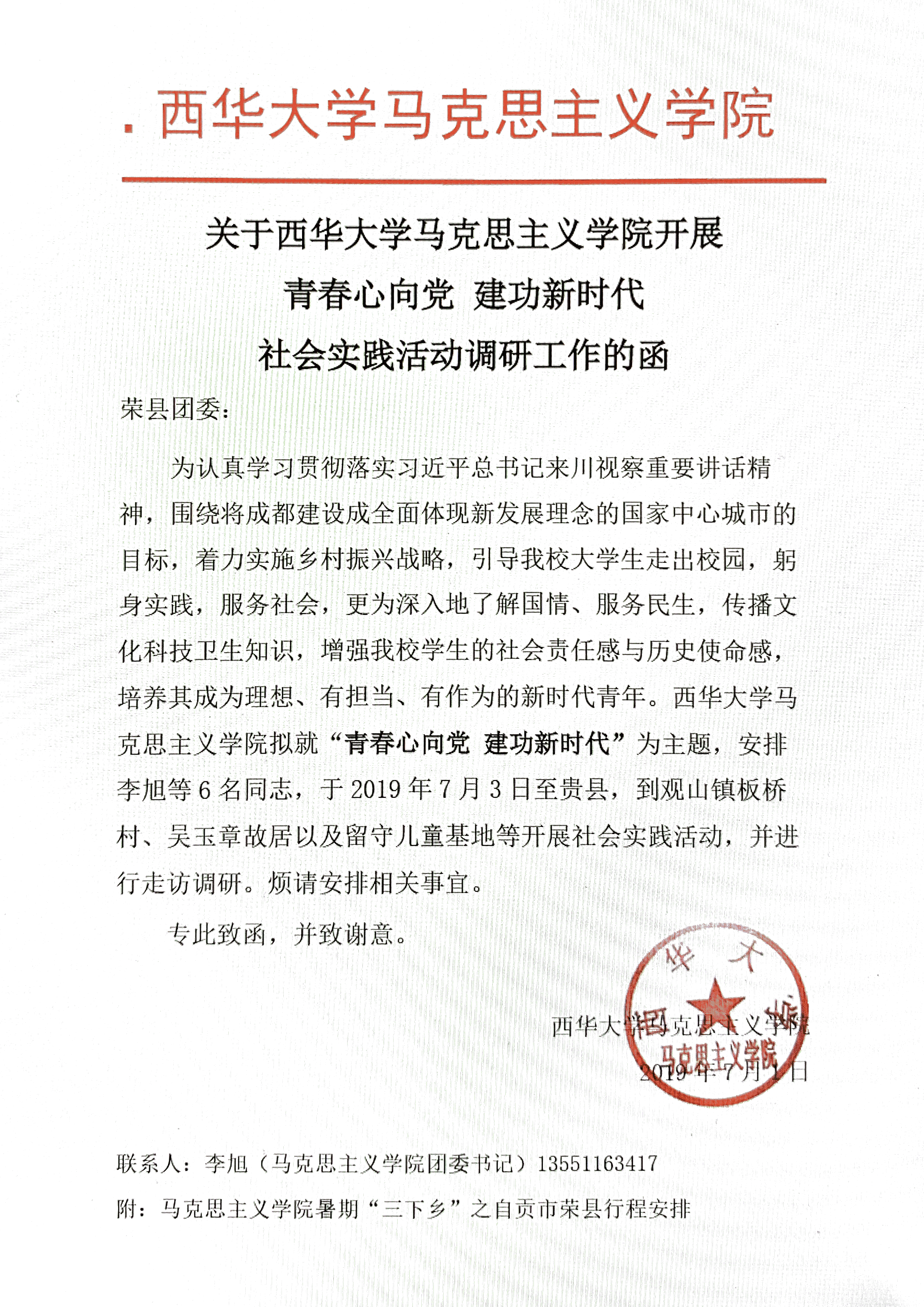 为学习宣传贯彻习近平新时代中国特色社会主义思想,引领教育广大青年学生勇做担当民族复兴大任的时代新人,以实际行动助力精准扶贫,服务国家战略,切实在感受中华人民共和国成立70年取得的新成就新面貌的生动实践中受教育、长才干、做贡献。bevictor伟德,伟德bv国际体育团委书记李旭老师带领学院志愿者团队赴自贡市荣县开展以“青春心向党,建功新时代”为主题的调研活动,深入了解荣县的精准扶贫落实情况、新农村建设状况、留守儿童教育关怀措施、地方团委在凝聚广大青年过程中工作开展情况。