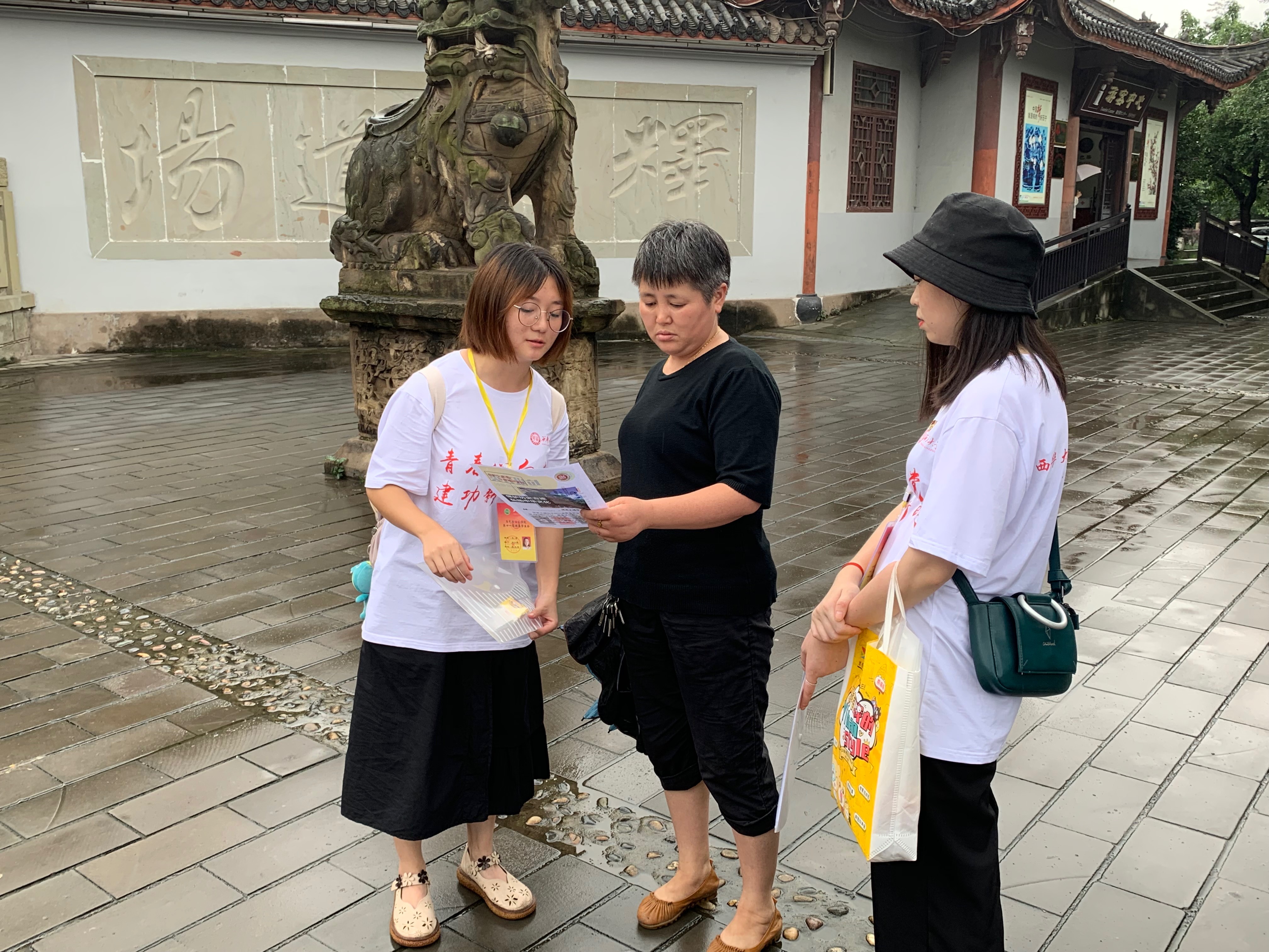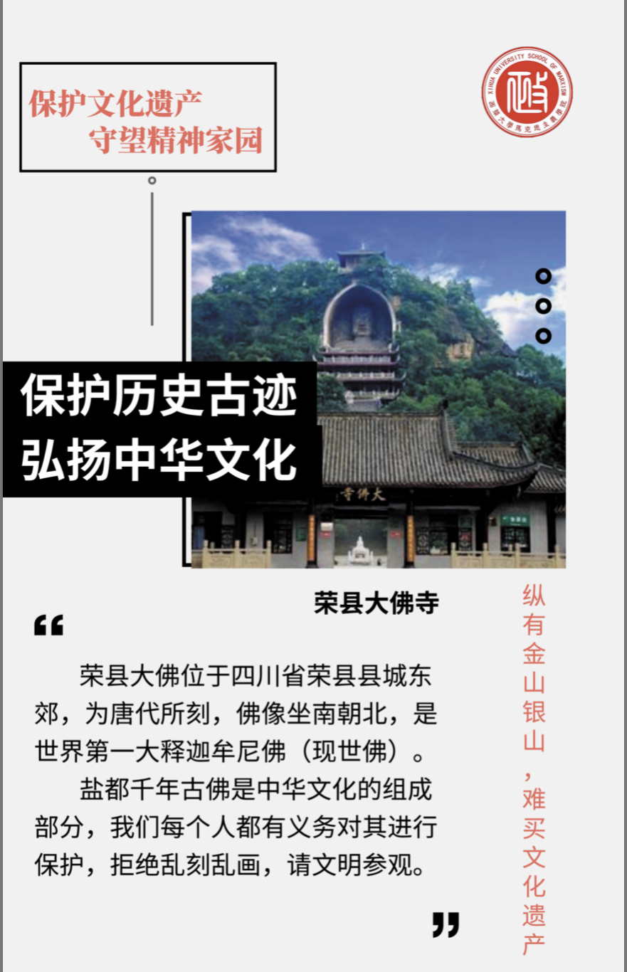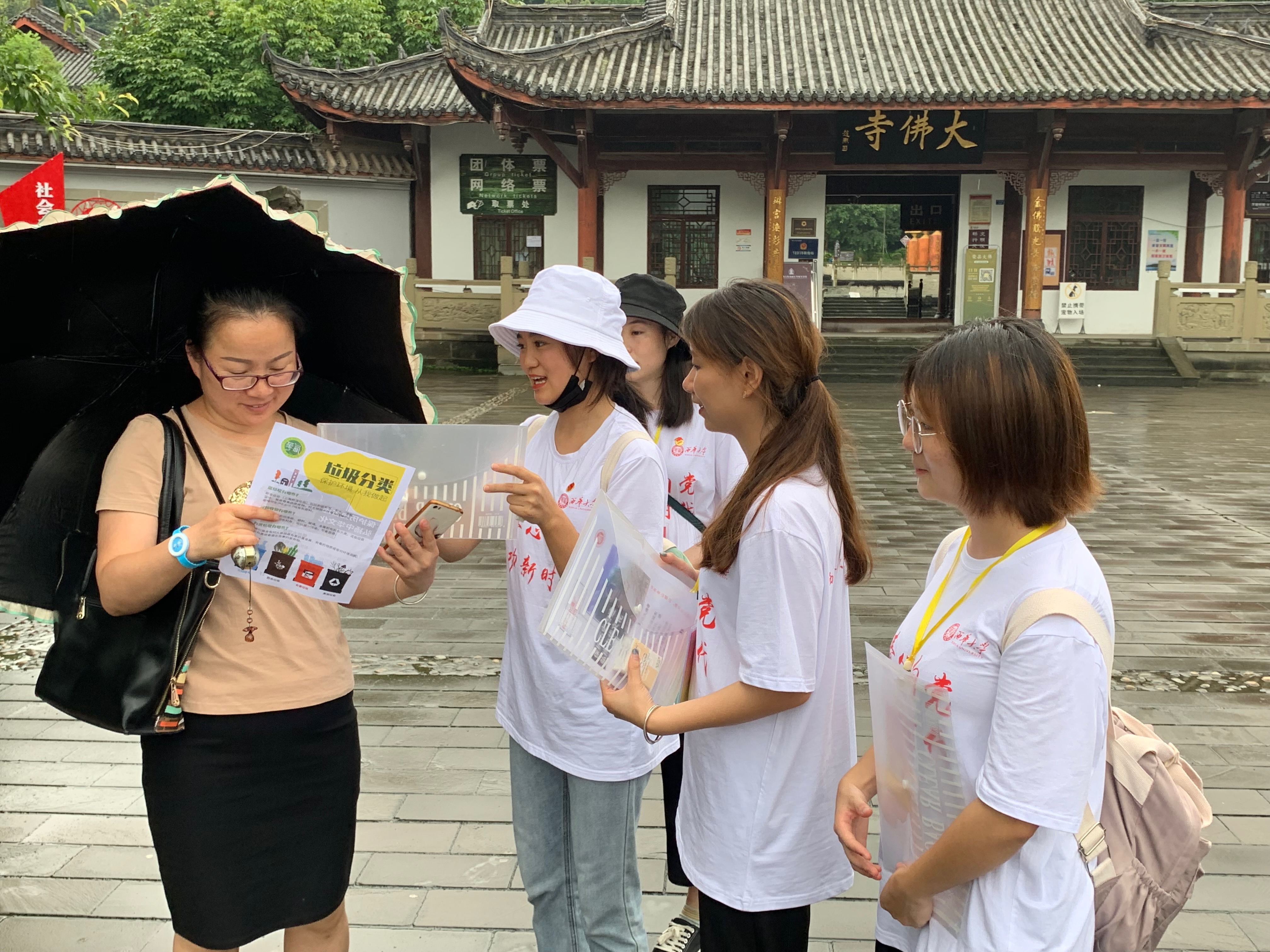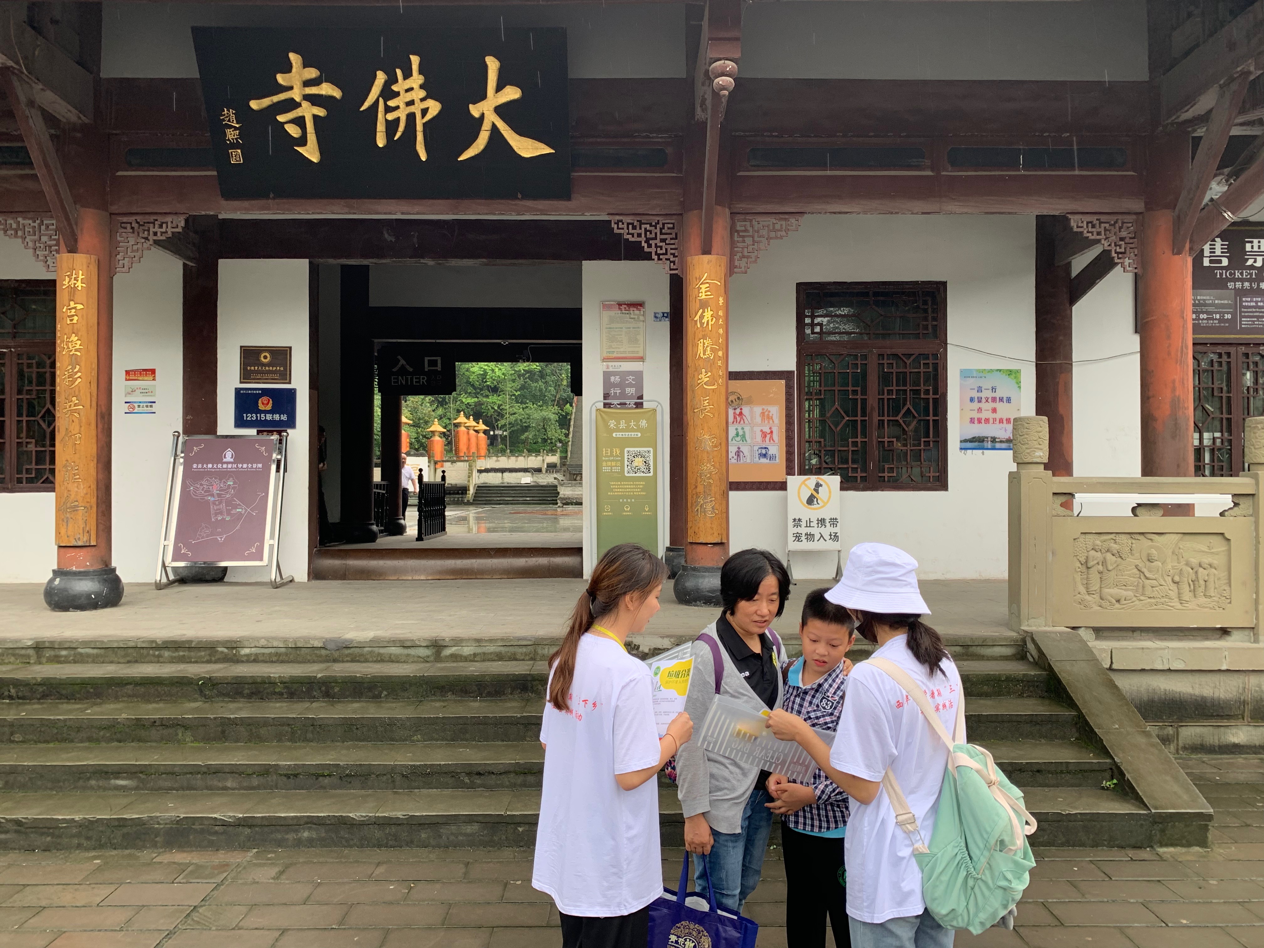 接下来,志愿者们于下午5时来到了荣县大佛寺开展以“美丽中国”为主题的志愿服务活动。首先,志愿者们参观了大佛寺,感受了历史文化气息。随后,志愿者们在大佛寺广场为游客们发放印有“保护历史古迹、弘扬中华文化”和“垃圾分类”内容宣传单。