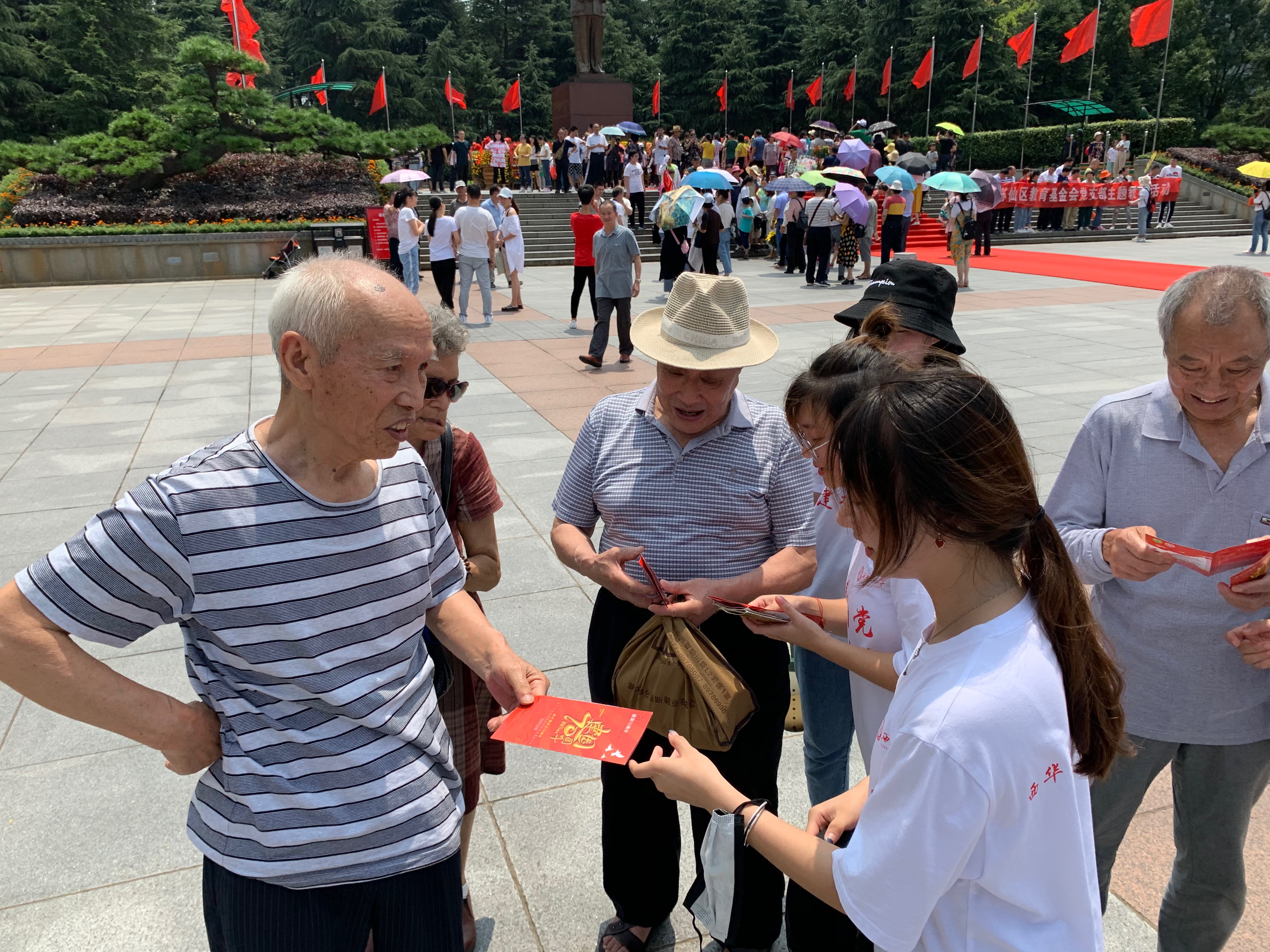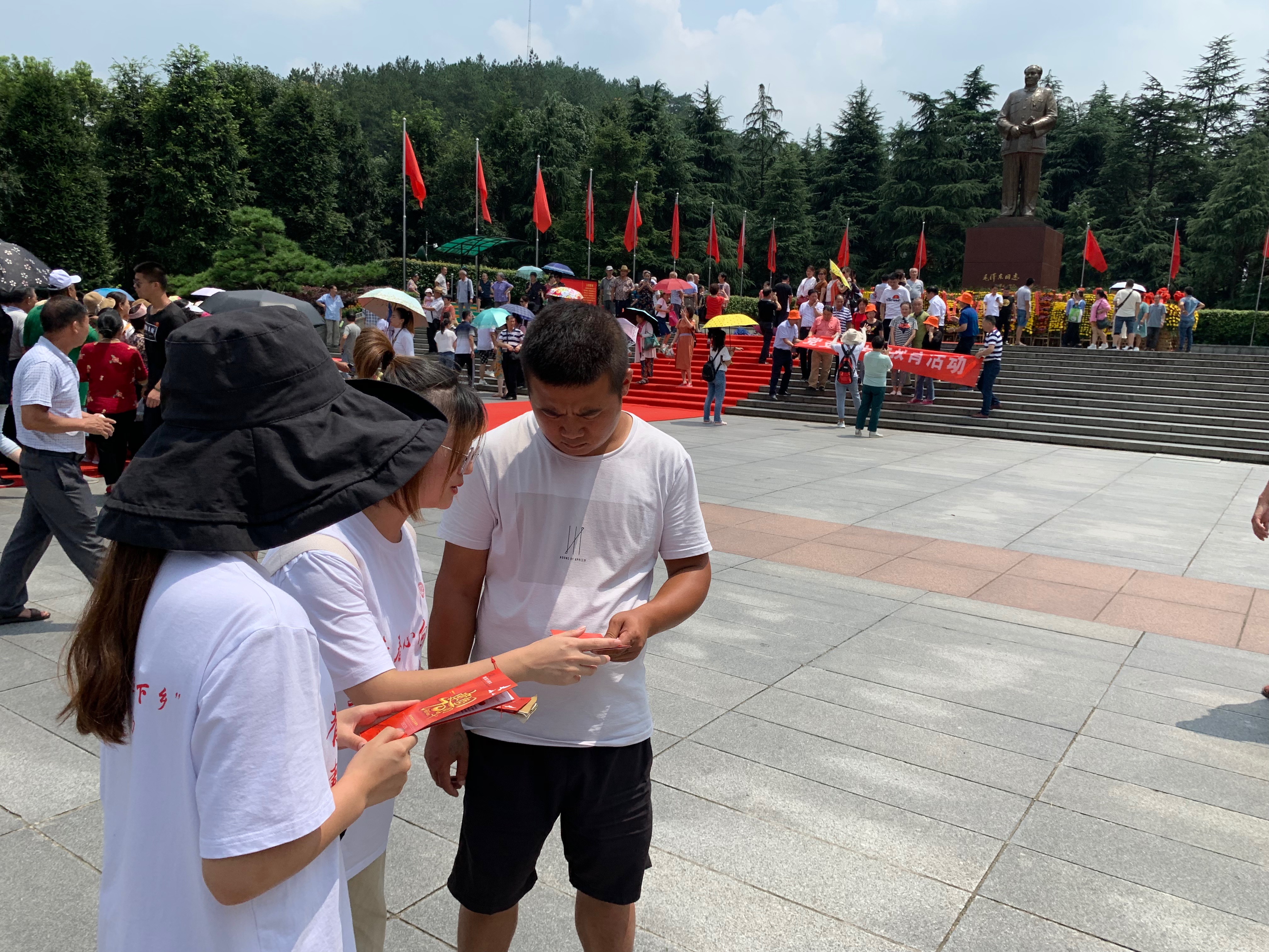 最后,志愿者们参观了毛泽东铜像广场。据了解,铜像是按主席在开国大典上的形象设计的,坐西南、朝东北。铜像高6米,底座高4.1米,寓意主席在位41年;全高10.1米,寓意国庆节;更象征着毛主席是新中国的缔造者。志愿者们在此缅怀主席的同时,还以发放“建国70年以来重大事件”宣传册的形式纪念新中国成立七十周年,弘扬了爱国主义精神,践行了青年学生“不忘初心、砥砺前行”的使命。