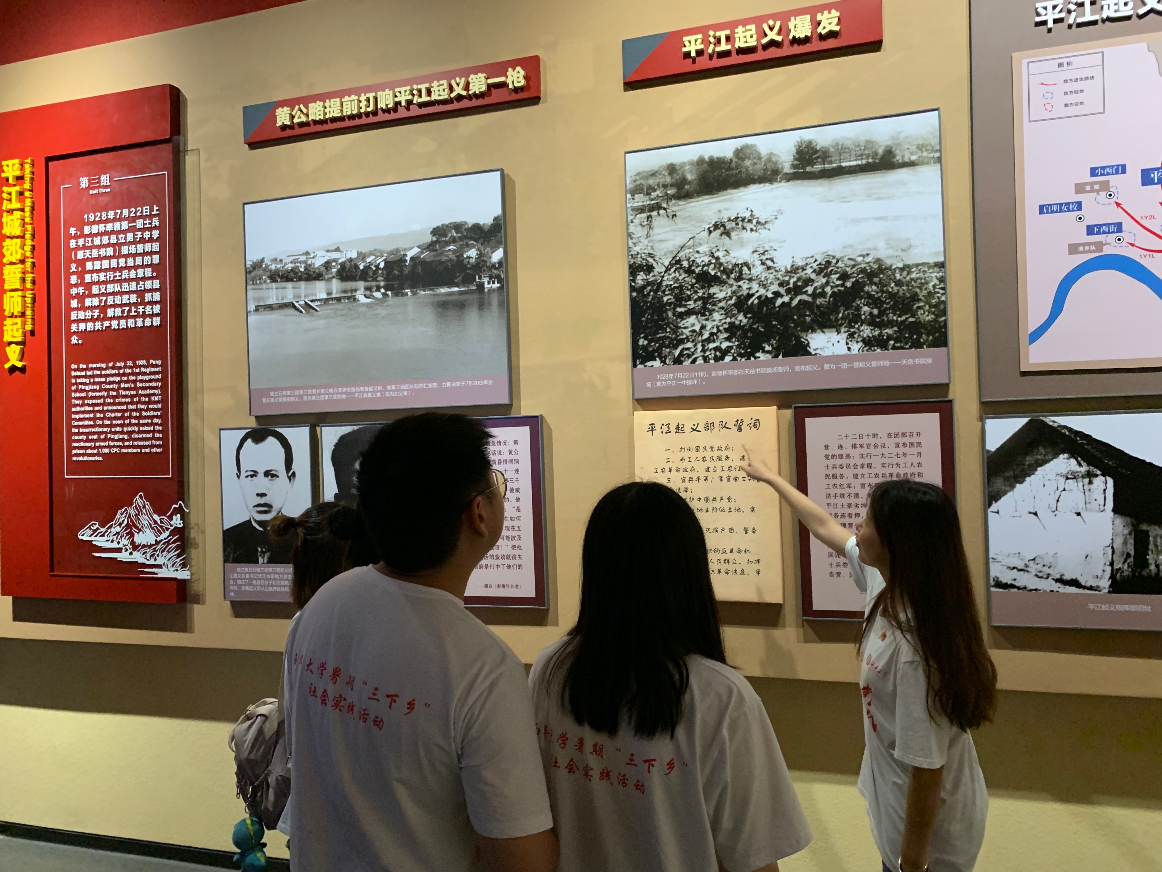 下午2点,志愿者们来到平江起义纪念馆。在讲解员的带领下,志愿者们先后参观了平江起义史料陈列馆、平江起义旧址和湘鄂赣革命根据地纪念馆,以及 “革命火种点亮平江大地”、“周密部署发动平江起义”、“艰苦转战,开辟湘鄂赣革命根据地”等展厅。馆内陈列的红色文物、图片真实地记录了彭德怀元帅领导的平江起义为创建人民军队、开辟湘鄂赣革命根据地、保卫中央苏区、建立人民共和国所做出的卓越贡献。革命先烈“出生入死为人民、浴血奋战飘红旗”的战斗历程,为了信仰不怕牺牲、追求解放的革命精神,深深震撼和激励着志愿者们。