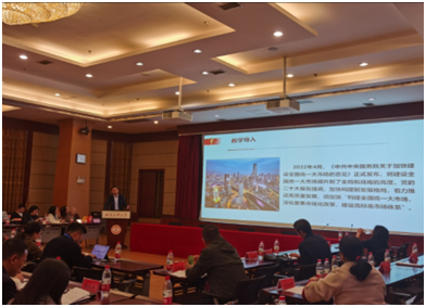 教学展示阶段,由我院党委书记万远英主持,青年教师冯庆元围绕硕士研究生课程《新时代中国特色社会主义理论与实践》中有关“经济建设”部分,对“建设全国统一大市场——构建新发展格局的基础支撑和内在要求”进行了精彩的教学展示,受到与会专家学者和师生们的一致好评。