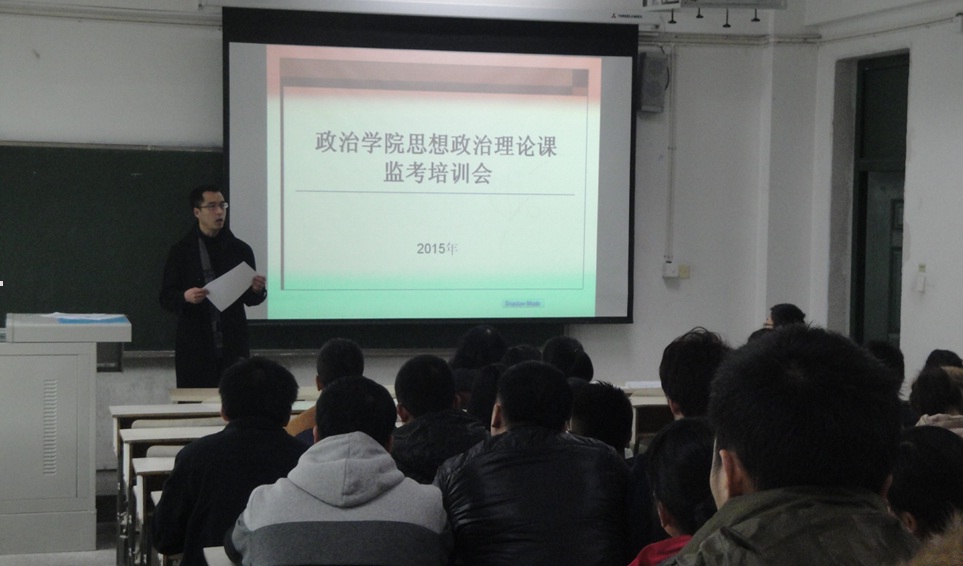 2015年1月12日政治学院于3C-302召开2014-2015学年第一学期思想政治理论课考务工作培训会。会议由政治学院副院长郑小明老师主持,本期思想政治理论课的全体监考和巡视人员都参加了此次会议。