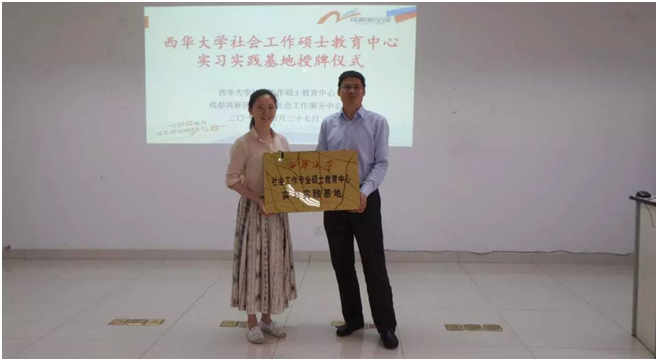 bevictor伟德社会工作硕士教育中心副主任朱琳向成都新空间理事长雷建授予“实习实践基地”牌匾