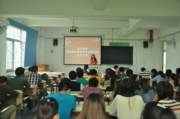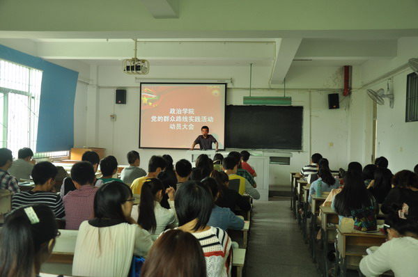 为进一步贯彻落实学校关于深入开展党的群众路线教育实践活动的精神,9月10日中午,政治学院在3D-301召开学生党员群众路线教育实践动员大会。报告会由学院党委副书记黄潇主持,学院党委书记刘曙光,院长万远英,副院长郑小明,学工办主任李旭及学院全体学生党员参加。