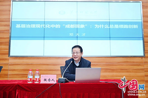 同时,华中师范大学中国农村研究院邓大才教授作了题为“基层治理现代化中的‘成都现象’:为什么总是领跑创新”的主旨报告。邓大才根据自身在成都的调研经历,对基层治理现代化创新中的“成都现象”进行了深入探究,对成都的基层治理实践影响因素进行了高度凝练和概括,指出成都的创新有着体制性、增量性、可持续性和领先性特点,并从领导力结构、制度结构和文化结构三个方面分析了“成都现象”中的结构性因素。