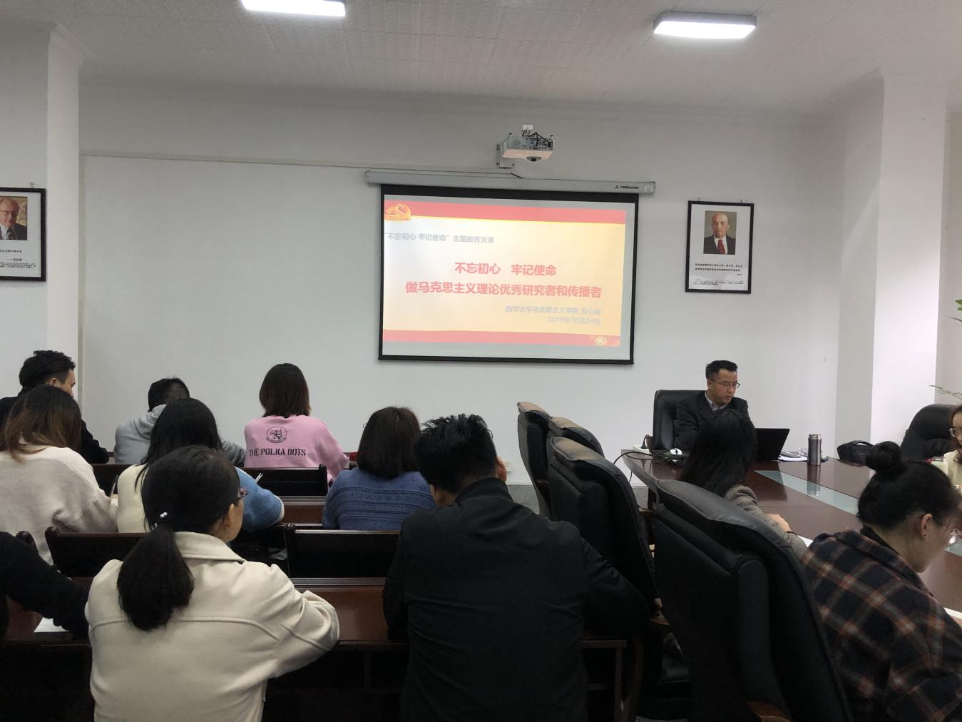 为深入学习贯彻中央和四川省委关于“不忘初心、牢记使命”主题教育工作会议精神,落实《bevictor伟德“不忘初心、牢记使命”主题教育学习教育工作方案》工作部署要求,我院近期扎实开展“不忘初心,牢记使命”主题教育系列活动。10月24日中午1点,我院副院长郑小明面向学院全体硕士研究生党员,在民主与治理研究中心作了题为“不忘初心、牢记使命,做马克思主义理论优秀研究者和传播者”专题党课。