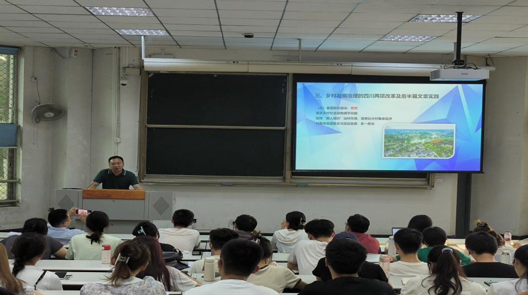 为深入贯彻落实习近平总书记关于“三农”工作的重要论述,贯彻落实中央经济工作会议精神,推进学院科研工作高质量发展,2024年5月23日下午,伟德bv国际体育邀请遂宁市委社会工作部副部长、市民政局副局长、市委基层治理办副主任田贵凡,在4A-102为学院师生作专题讲座。本次讲座题为“从乡村人口流向看乡村社会整合——新型城镇化背景下党建引领乡村发展治理的关注点”。讲座由学院副院长王贝主持。学院教师代表和2022级、2023级全体硕士研究生参加此次讲座。