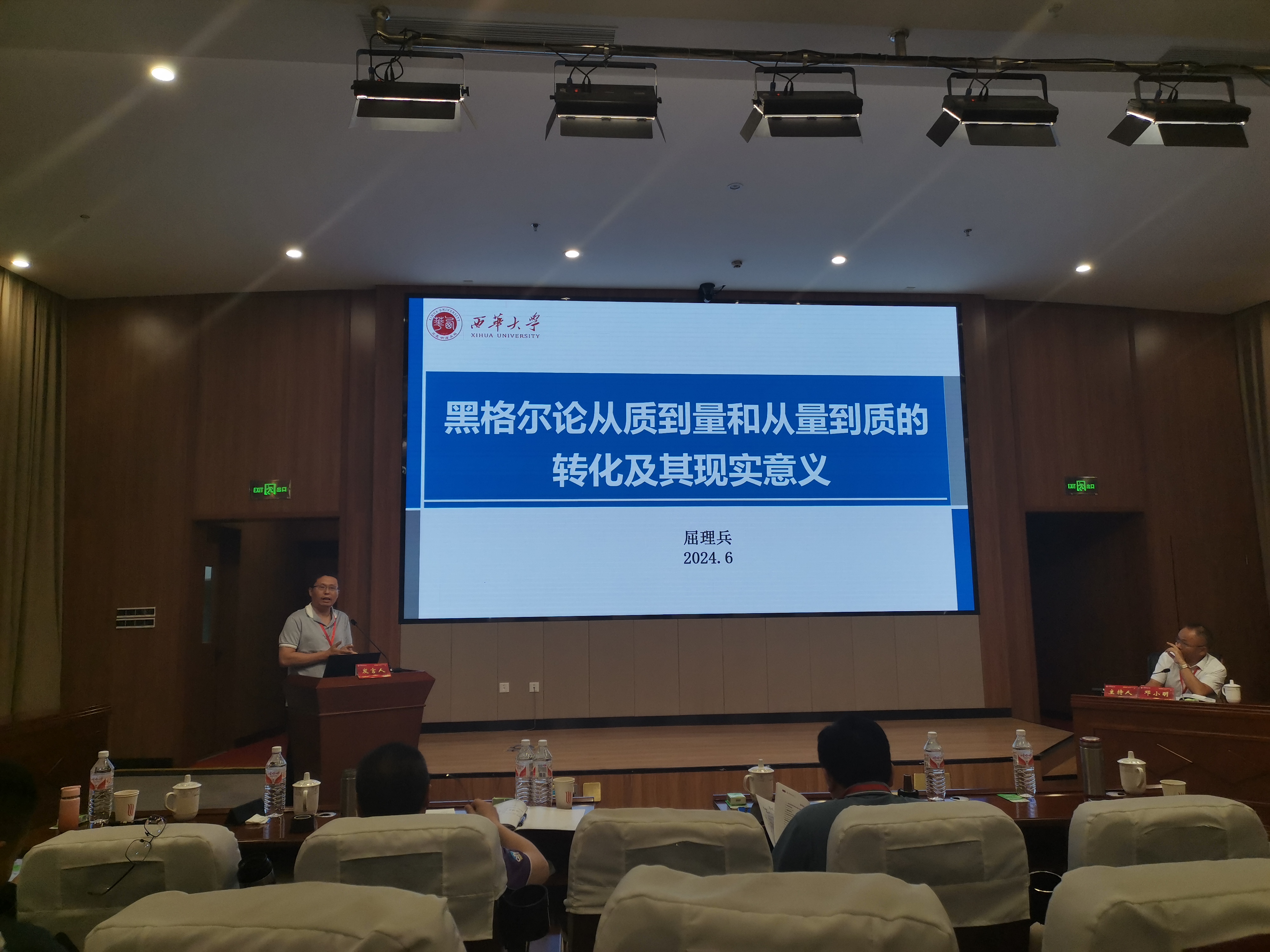 在交流发言环节,我院屈理兵博士,作为教师代表作了题为《黑格尔论从质到量和从量到质的转化及其现实意义》的主旨报告。报告聚焦文本,深入考究黑格尔对于质和量演化的内在规律阐释,并且介绍了马克思和列宁对于黑格尔质量互变理论的批判和发展。在新质生产力理论视域下,黑格尔的质量互变理论对现代经济发展前景提供了有益的理论和实践价值反思。