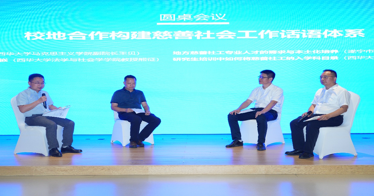在“党建引领、专业牵引”慈社融合主题交流活动和圆桌会议环节,研究生院副院长苏文明、伟德bv国际体育副院长王贝、法学与社会学学院副院长熊征、遂宁市委社会工作部副部长田贵凡作专题发言。