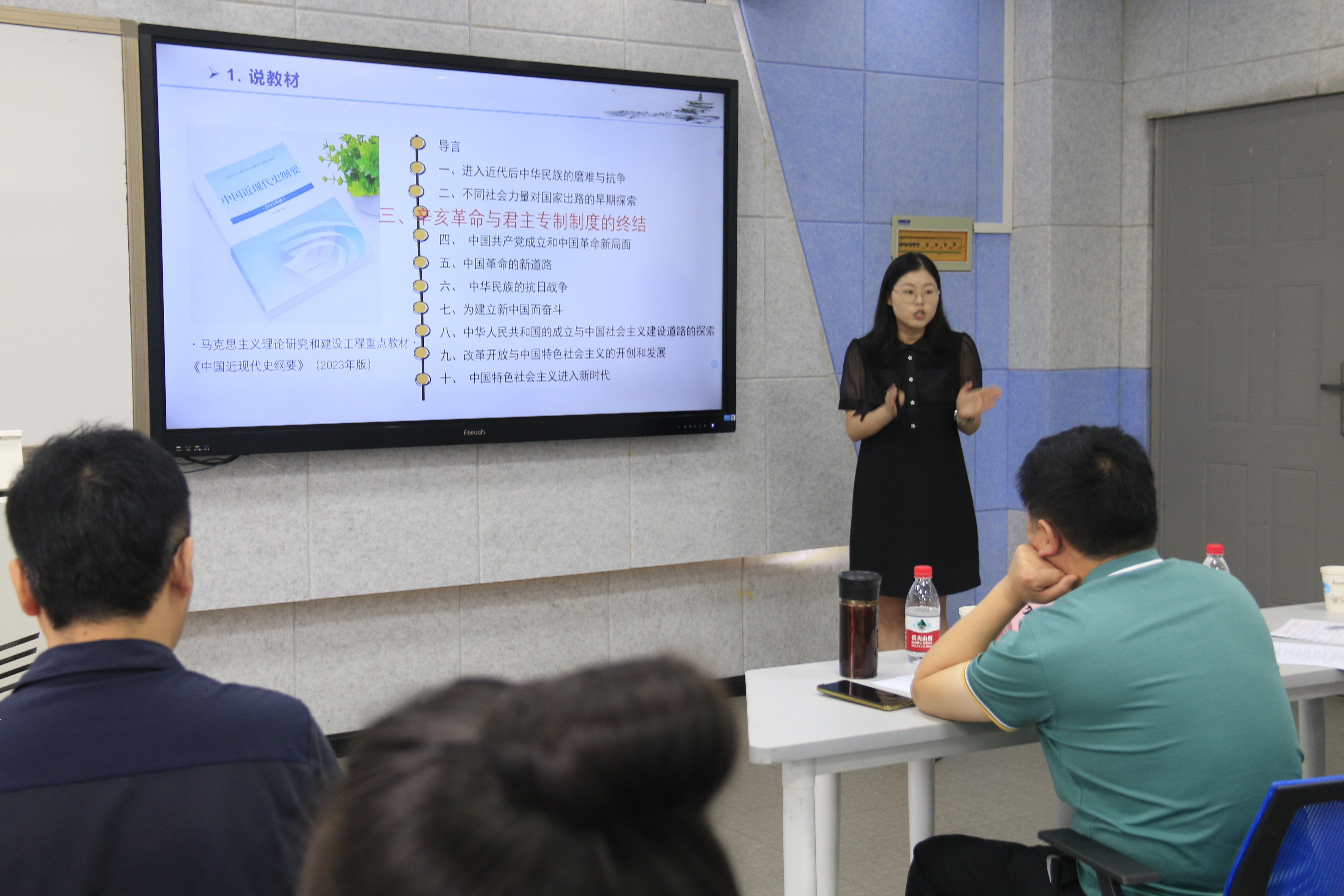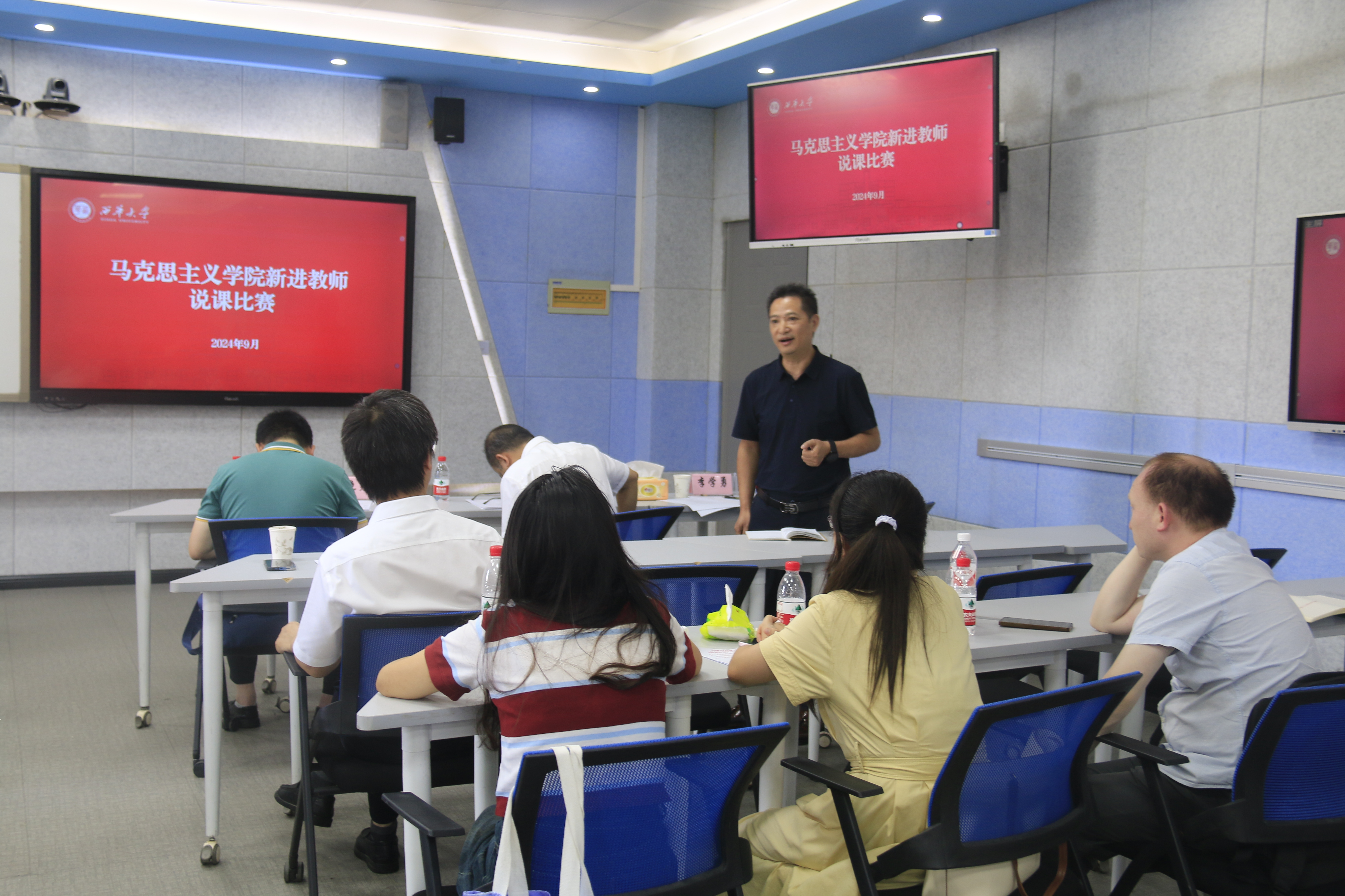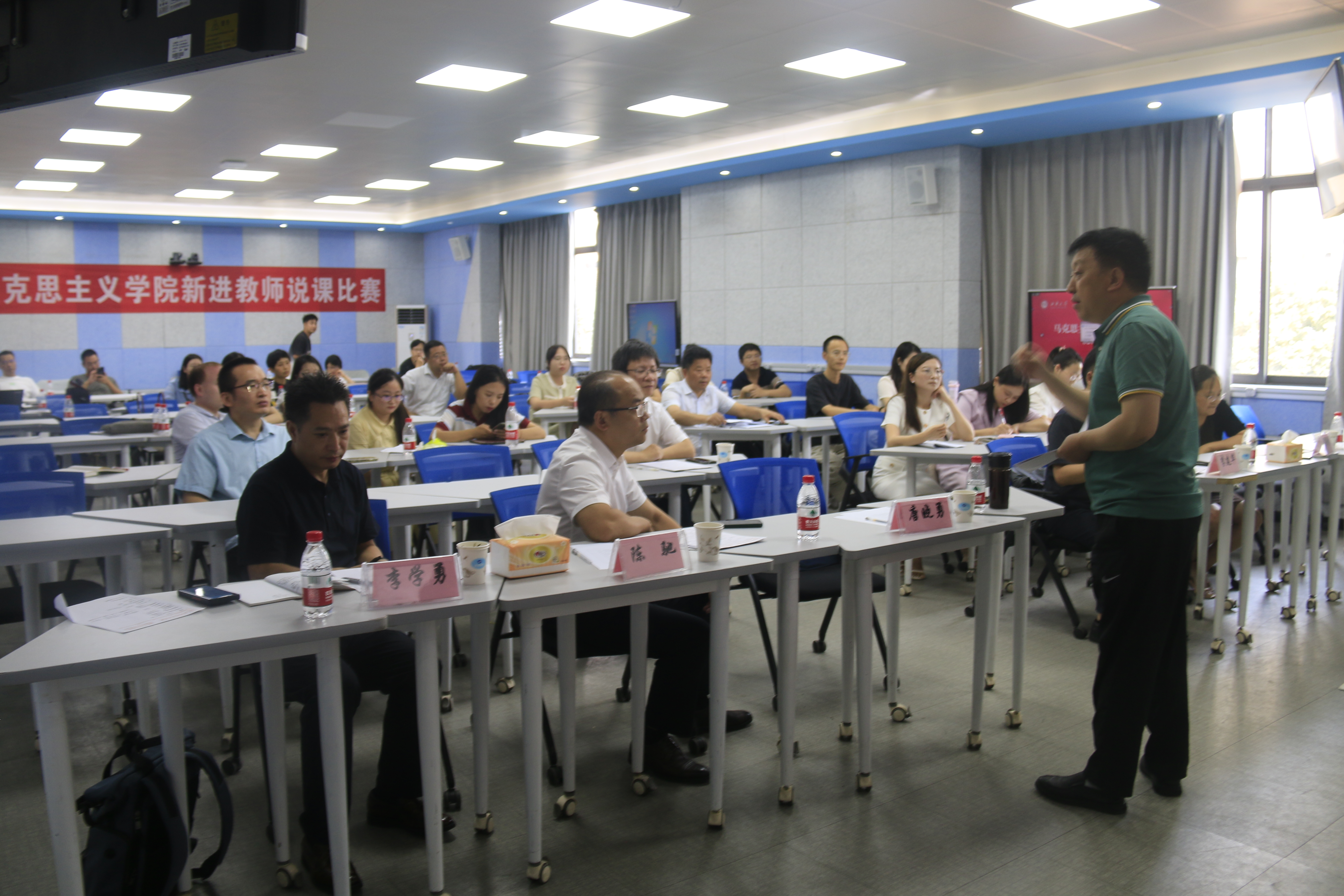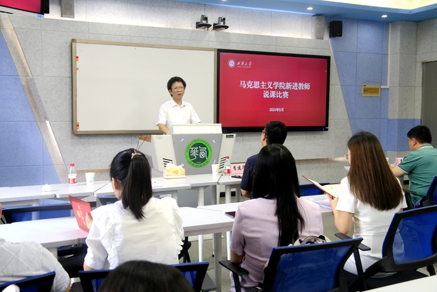 本次说课比赛共有18位青年教师参加,比赛采用“10分钟说课+专家评委点评”的形式进行。教师们通过抽签决定参赛顺序,参赛教师围绕说教学内容、说教学目标、说学情、说教学学法、说教学过程、说课程思政的融入等方面展开阐述。所有参赛教师准备充分、精神饱满、昂扬向上,说课结构完整,教法、学法设计合理,课程思政点融入自然,教态自然稳重、语言简洁流畅,整个说课比赛充分展示了马院青年教师的风采。