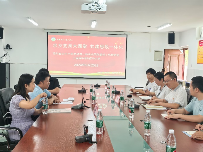 仪式结束后,双方就“四川省大中小学思政一体化共同建设”进行交流。伟德bv国际体育副院长尹德志表示,bevictor伟德,伟德bv国际体育将全力支持三道堰中学的思政课程建设,通过加强师资培训、课程研发和教学研究等方面的合作,共同构建大中小学思政课一体化的新格局。三道堰中学校长李红光表示,三道堰中学将进一步推动思政课程内容与教学方式方法的创新,增强思政课的吸引力和感染力,以更好地培养学生的社会责任感、创新精神和实践能力。继续探索和高校合作的新路径,实现资源共享,优势互补。期间双方就思政课程教学资源的整合、教学方法的创新、教学评价体系的完善等具体问题进行了深入探讨,并达成了一系列共识。预期在未来建立常态化的沟通协调机制,共同推动思政课程的内涵式发展与高质量发展。
