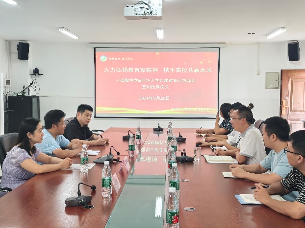 9月26日,伟德bv国际体育副院长尹德志、思想政治教育系主任何为、思想政治教育教研室主任王雪峤、2025届毕业班辅导员钟兴悦与三道堰中学校长李红光以及教师代表在三道堰中学会议室开展教育实践基地签约挂牌仪式暨四川省大中小学思政一体化共同建设推进会。