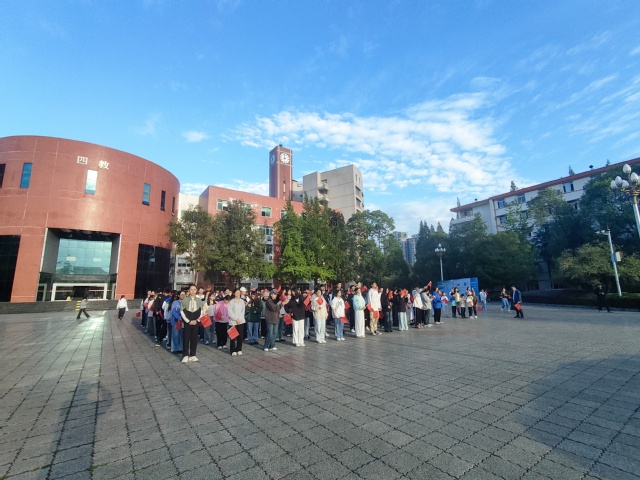 随着激昂的进行曲奏响,伴随着铿锵有力的脚步声,国防特勤大队护送着鲜艳的五星红旗一步步走入大家的视线之中,迈着整齐划一的步伐走向升旗台。在庄严的国歌声中,鲜艳的五星红旗缓缓升起,迎风飘扬。全体师生肃立,面向国旗行注目礼,高唱国歌。激昂的旋律在校园上空回荡,每一个音符都饱含着师生们对祖国的深深热爱和祝福。