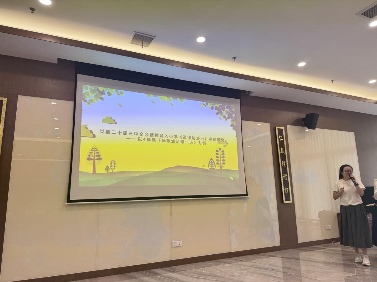 随后,小学、初中、高中三个学段的教师代表分别展示了将党的二十届三中全会精神融入课程教学。各学段展示后,现场的老师进行了认真的点评,并提出了宝贵的建议。小学教师代表以《低碳生活每一天》为主题,以地球发“烧”了导入,展示了如何将学生生活、环保理念与全会精神相结合,引导学生从小树立绿色低碳的生活习惯。初中教师代表则以《创新改变生活》为主题,通过介绍科技创新在日常生活中的应用案例,并与新质生产力相结合,激发学生对科技创新的兴趣和热情。高中教师代表深度贯彻党的二十届三中全会精神,将其内容深度融入课堂,遵循了循序渐进、螺旋上升的原则。展示结束后,思想政治教育系主任何为进行了总结。