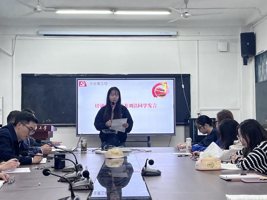学员代表刘洁同学发言。刘洁同学表示,参加此次培训,不仅是学习党的历史,更要汲取这段历史背后所蕴藏的智慧和精神,坚定理想信念,端正入党动机。她呼吁全体学员在本次培训中要做到以下几点:一要端正态度,珍惜这次学习机会;二要在平时生活中,以党章作为行为准则,以党员标准严格要求自己;三要学以致用,牢记党的宗旨,积极参与志愿和实践活动。通过此次培训,都能有所收获,有所提高,做一名思想政治素养高、专业知识过硬的优秀学生。