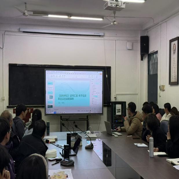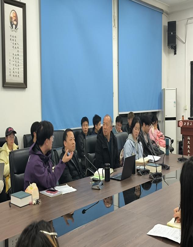 读书会第一个环节是学生分享展示,7位同学主要围绕恩格斯《反杜林论》展开读书分享活动。同学们主要从《反杜林论》的作者简介、写作背景、文本内容及现实意义阐述了自己的理解,并从中选取部分经典名句展开详细解读。其中研一同学分享《反杜林论·哲学篇》中的关于道德的思想,关于“人能否脱离阶级性去看待道德”,同学们对此展开了激烈讨论。本科同学提出的关于“劳动价值论是否能够全面解释现代经济中商品和服务的价值构成”“社会炼金术”的疑问,王贝教授与薛兴国教授进行详细解答。