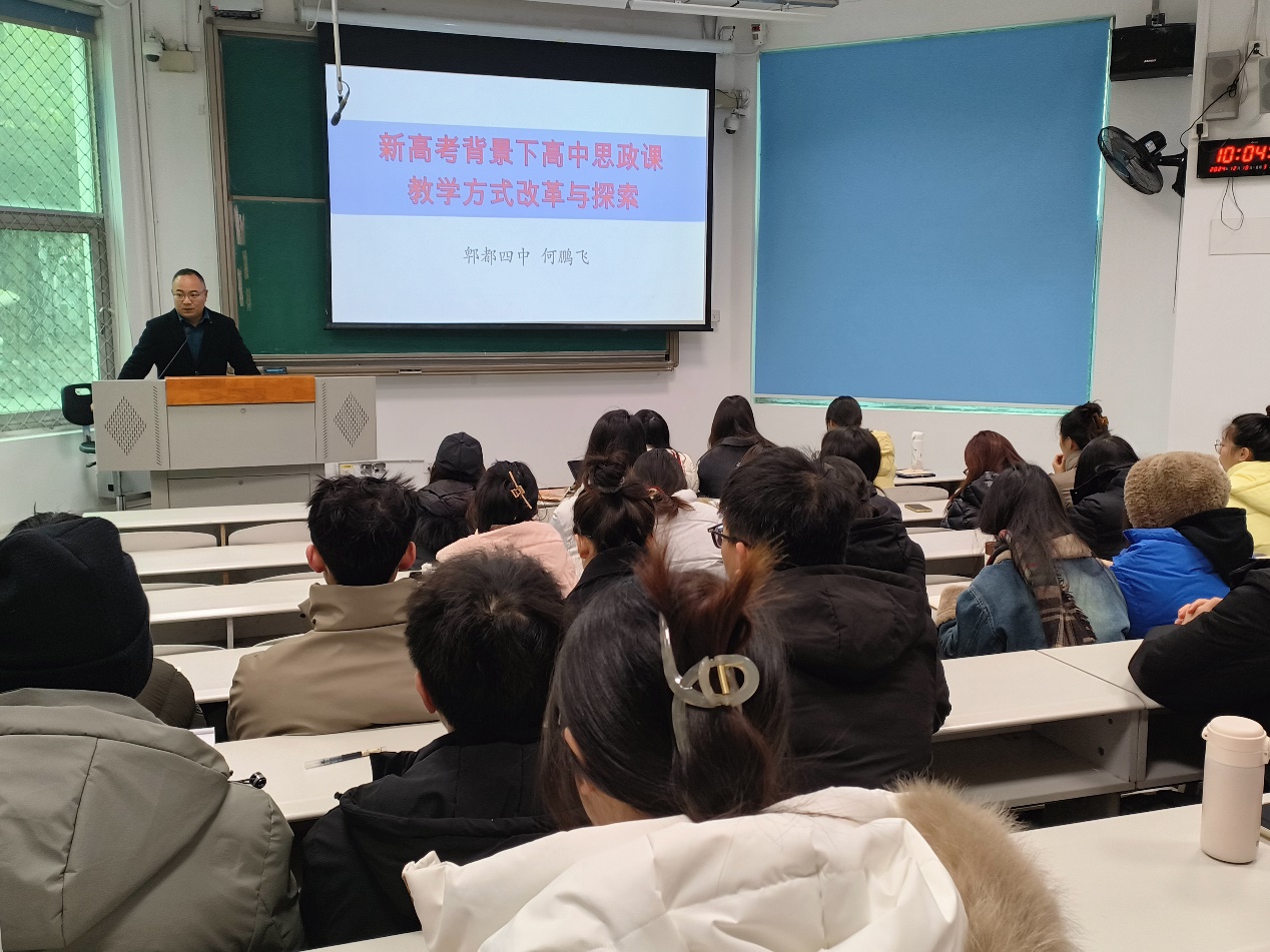 “高考改革新动向,思政课堂育新人。”12月18日上午,应学院邀请,成都市青年骨干教师、高中教育教学先进个人-——郫都四中副校长何鹏飞在4A-105教室作了题为“新高考改革背景下高中思政课教学方法改革与实践”的讲座。本次讲座由伟德bv国际体育副院长王贝和刘英副教授主持,学科教学(思政)以及马克思主义理论学术硕士研究生参加。