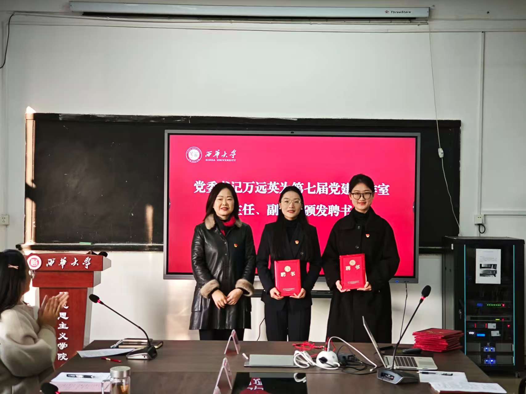学院党委书记万远英教授为第七届党建工作室主任、副主任颁发聘书