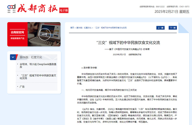 2025年2月21日,《成都商报》第六版“红星文化”专栏刊发了bevictor伟德“四川省铸牢中华民族共同体意识研究基地”副主任吴会蓉教授与研究生陈会敏撰写的关于中华民族饮食文化在中华各民族交往、交流、交融中发挥重要作用的研究文章。全文如下:
