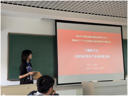 研讨会分设十个分论坛,我院研究生尹可佳与闫钰洁所撰写的论文《以新质生产力主攻民族地区特色优势产业:逻辑进路、现实困境与纾困路径》受邀参会,尹可佳作报告,论文在深入剖析民族地区自身发展现状的基础上探讨何以可能、以何赋能、如何推进西部民族地区特色优势产业发展,从而助推新时代西部大开发新格局进一步形成。