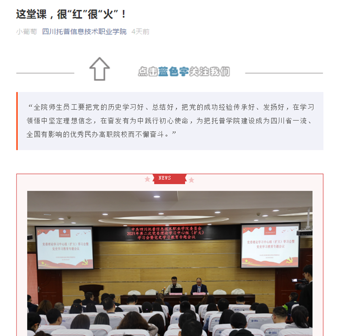 应四川托普信息技术职业学院邀请,我院副院长郑小明于4月20日赴四川托普信息技术职业学院为该院党委理论学习中心组(扩大)学习会暨党史学习教育专题会议做党史学习教育专题辅导报告。四川托普信息技术职业学院党委书记、省政府驻学院督导专员沈邦兵主持会议,学院领导班子成员、各基层党组织书记、各系部负责人等近200人参加了报告会。