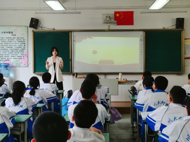 为深入学习贯彻落实习近平总书记在党史学习教育动员大会上的讲话,推动党史学习教育走心走深走实,伟德bv国际体育2018级研究生杨天菊于4月28日走进四川大学附属中学初二4班的课堂以《在奋斗和奉献中实现青春梦想》为题开展党史教育课。