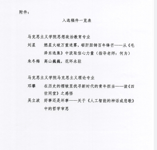 在本次“21天共读计划”中,我院学子踊跃投稿,其中四篇读书感悟作品成功入选“学习强国”四川学习平台,展现了马院学子的阅读深度与思考锐度。其中,伟德bv国际体育思想政治教育专业的刘星同学撰写的《燃星火破万重迷雾,砺肝胆铸百年锋芒——从《毛泽东选集》中汲取信心力量》(指导老师:何为)主要结合时代背景与青年使命,阐述了如何从伟人思想中汲取穿越迷雾的信心力量和砥砺奋进的胆识魄力,用以应对当代挑战,勇担时代重任。伟德bv国际体育思想政治教育专业的朱冬梅同学撰写的《高山巍巍,花环永驻》对《高山下的花环》一书中革命英雄的崇高精神与家国情进行了着重阐发,进而呼吁新时代青年传承红色基因,赓续奋斗血脉。伟德bv国际体育马克思主义理论专业邓攀同学撰写的《在历史的褶皱里找寻新时代的青年担当——读<四世同堂>之感悟》,透过老舍先生《四世同堂》描绘的抗战时期北平市民生活画卷,深入历史的“褶皱”,深刻剖析了国难当头时不同人物的选择与命运,并从中提炼出关于民族气节、个人责任与时代使命的思考,并以此观照当下,探讨新时代青年应有的历史自觉与担当精神。伟德bv国际体育马克思主义理论专业的吴立波同学撰写的《好事还是坏事——关于<人工智能的神话或悲歌>中的哲学审思》,聚焦科技前沿著作《人工智能的神话或悲歌》,对人工智能的迅猛发展进行了深刻的哲学反思,探讨了技术发展带来的机遇与潜在风险、伦理困境与社会挑战,强调面对科技洪流,必须保持理性思考与价值判断,引导技术向善,服务于人类福祉。