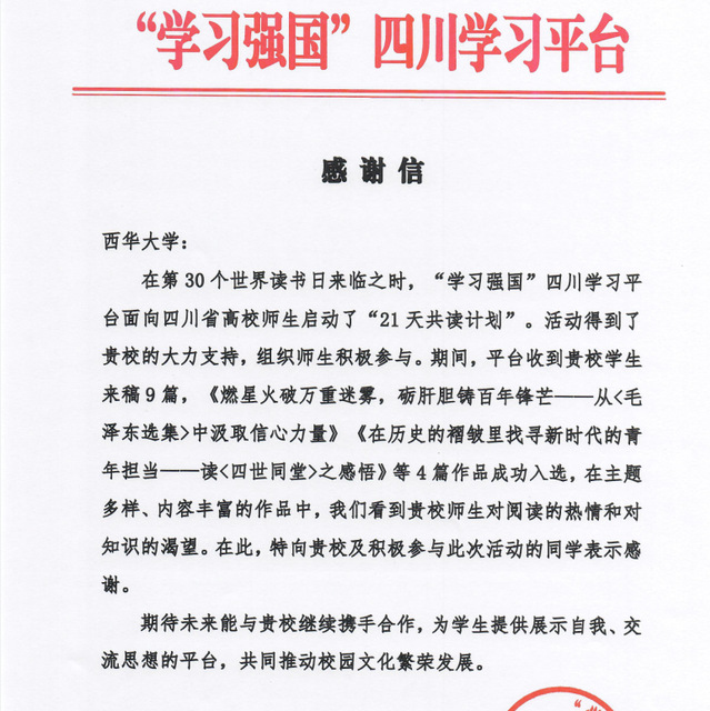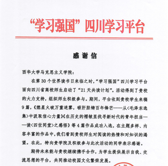 近日,“学习强国”四川学习平台向bevictor伟德和伟德bv国际体育发来感谢信,对我校师生在平台发起的“21天共读计划”活动中展现出的热爱阅读、积极思考的精神风貌表示充分肯定,高度赞扬学校和学院组织工作的成效。