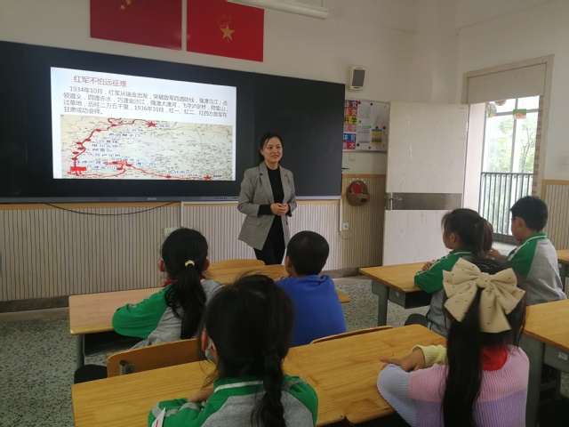 王海荣声情并茂一边讲故事,一边设置问题启发学生开动脑筋、努力思考:“是什么力量激励红军冒着生命危险飞夺泸定桥,强渡大渡河?”“是什么信仰让黄继光纵身一跃用身体堵住美军扫射的枪口?”“原子弹研制成功背后经历了哪些艰辛和曲折?”在同学们积极踊跃的回答、不厌其烦的追问和教师恰如其分的引导中,红色种子悄然种进了心田里,孩子们对共产党的认识生根发芽,对共产党的崇敬之情也油然而生。