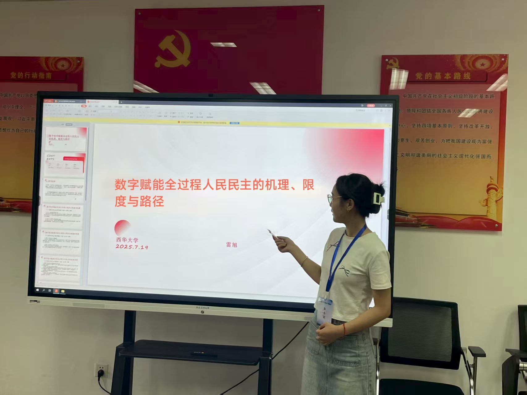 2023级研究生雷旭所撰写的论文《数字赋能全过程人民民主的机理、限度与路径》在“数智时代的政治与法治”分论坛上发言,论文从全过程人民民主的基本概念出发,强调数字技术对于全过程人民民主的赋能效应主要体现在赋能资源要素整合、全员参与、全程参与、全面参与四个方面;但还存在着制度智能化建设不足、人民数字化参政能力匮乏、数字基础设施建设不足等问题,为此需要精准施策,提升赋能效果。