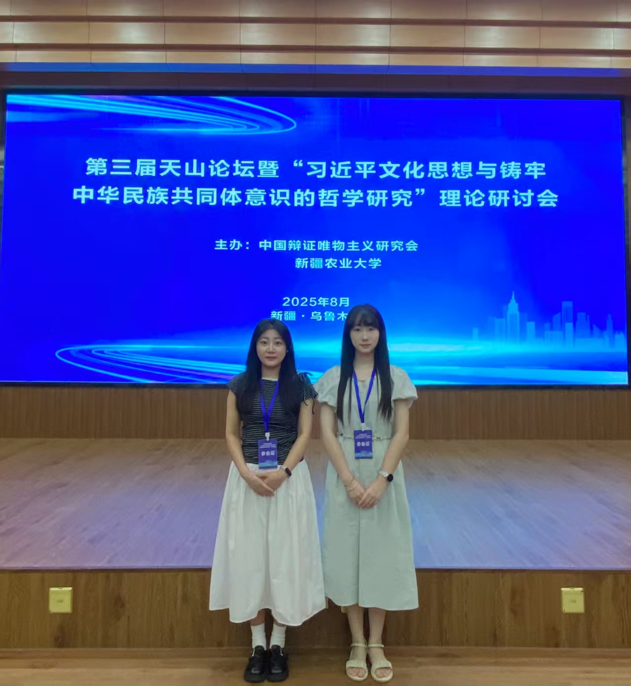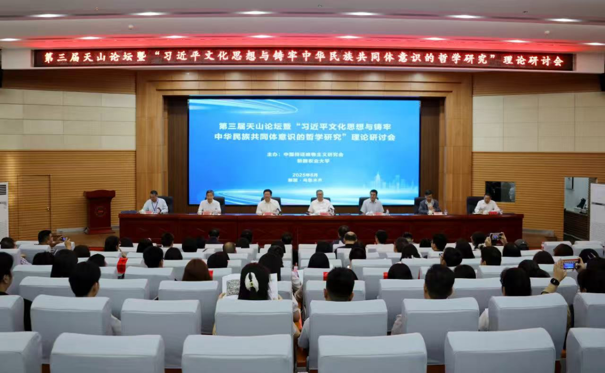 2025年8月25日,中国辩证唯物主义研究会第三届天山论坛暨“习近平文化思想与铸牢中华民族共同体意识的哲学研究”理论研讨会在新疆农业大学八一会堂学术报告厅举办。本次研讨会由中国辩证唯物主义研究会、新疆农业大学主办,《马克思主义哲学》编辑部协办。第十三届全国政协常委、民族和宗教委员会主任、中国社会科学院原党组书记、院长,中国辩证唯物主义研究会会长王伟光,第十三届全国政协常委、原国防大学中将副校长毕京京,新疆农业大学党委书记谢树青,新疆农业大学党委办公室、校长办公室主任王广良出席会议。来自新疆农业大学、中共中央党校、西北工业大学、华中师范大学、东北师范大学、安徽大学、新疆大学、bevictor伟德等全国50多所高校、党校、社科院系统的100多名专家、学者以及师生代表参加了会议。bevictor伟德,伟德bv国际体育2023级研究生梁路路、梁爽受邀参会。