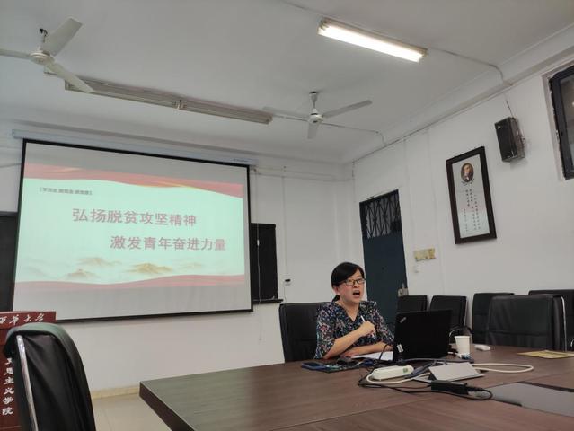 郑丽同志就脱贫攻坚为主题,将其内容、措施、成效以及意义进行了深入讲解,为支部同志们讲述了一个个动人的脱贫故事,以此作为激发当代青年不断奋进的精神力量。无论是扎根边疆、用教育为女孩们筑梦的张桂梅,回乡奉献、谱写新时代青春之歌的黄文秀,还是历时30余年,靠着锄头、钢钎、铁锤和双手,硬生生在绝壁上凿出一条长9400米、地跨3个村的“生命渠”的时代愚公黄大发。都让在座的同志无比动容。郑丽同志强调,时代造就英雄,伟大来自平凡。面对党中央的要求、人民的呼唤,一批批共产党员挺身而出、奔赴脱贫战场,做到尽锐出战。初心赴使命 热血写春秋。年轻一代有自己的担当与使命,以一名共产党员的职责意识与担当精神全心全意为人民服务。
