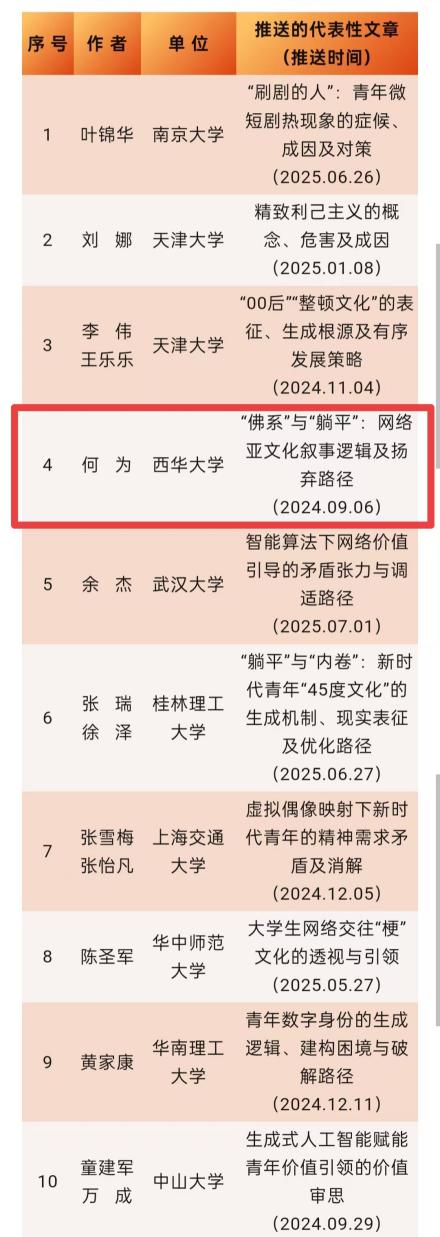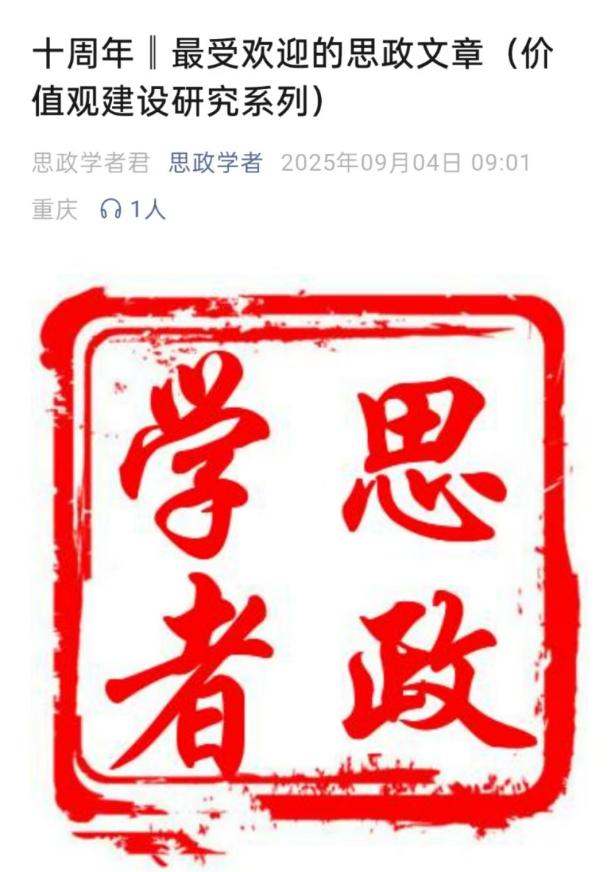 2025年9月4日,“思政学者”平台十周年庆典系列评选结果正式揭晓,我院教师何为论文《“佛系”与“躺平”网络亚文化叙事逻辑及扬弃路径》,在“价值观建设研究系列”评选中成功入选“最受欢迎的思政文章”(价值观建设研究系列)。