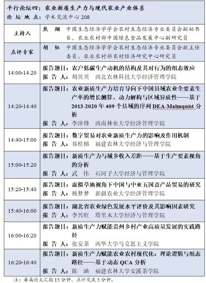18日上午,是开幕式和主旨报告环节,开幕式由福建农林大学乡村振兴学院副院长范胜龙主持,先后由福建农林大学党委常委、副校长周顺桂,福建社科院党组成员、副院长何建津及中国生态经济学学会理事长、中国社会科学院农村 发展研究所党委书记、副所长杜志雄致辞。主旨报告由中国生态经济学学会副理事长、农村生态经济专业委员会主任委员、中国社会科学院农村发展研究所研究员包晓斌主持,随后中国生态经济学学会农村生态经济专业委员会副主任委员张利国就《农业社会化服务与农业新质生产力:效应、机制与空间 溢出》作报告;尹世久就《中国式农业农村现代化及其生态环境意蕴》作报告;胡钰就《新质生产力加速农业绿色转型的理论逻辑与实践路径》作报告;苏时鹏就《生态退化区乡村生态振兴的资源编排与多主体价值共创分析》作报告,为与会者带来了一场高水平的学术盛宴。