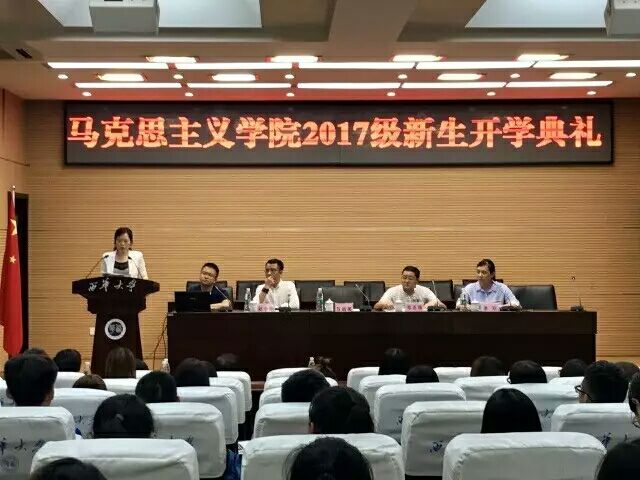 秋高气爽,丹桂飘扬。9月7日下午3点,伟德bv国际体育2017级新生开学典礼在行政楼一楼报告厅举行。学院院长万远英、党委书记毛正强、党委副书记兼副院长李欣、副院长郑小明、思想政治教育系主任王贝、教学办主任冯东、学工办主任李旭、学院教师代表刘英博士、2017级新生辅导员梁玲云等出席了本次典礼。2017级本科和研究生全体新生参加本次开学典礼。典礼在李欣副书记的主持下有序进行。