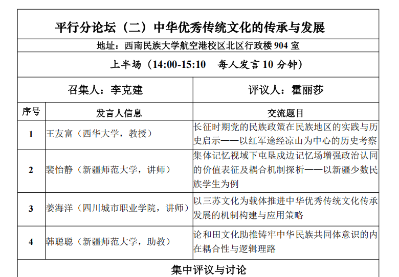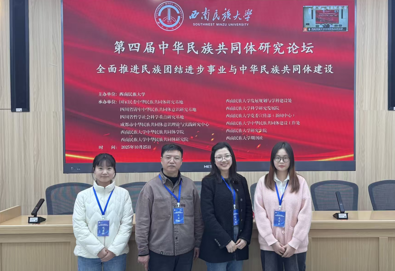 10月25日,由西南民族大学主办、国家民委中华民族共同体研究基地、四川省铸牢中华民族共同体意识研究基地等单位承办的“西南民族大学第四届中华民族共同体研究论坛”在西南民族大学航空港校区举行。来自中南财经政法大学、武汉大学、四川大学、中央民族大学、中共凉山彝族自治州委党校、西北民族大学、bevictor伟德等省内外高校、党校系统的专家学者、硕博士研究生参加研讨会。bevictor伟德,伟德bv国际体育王友富教授与杨琳博士、2024级研究生盛文琴与2025级研究生郑姣姣受邀参会。