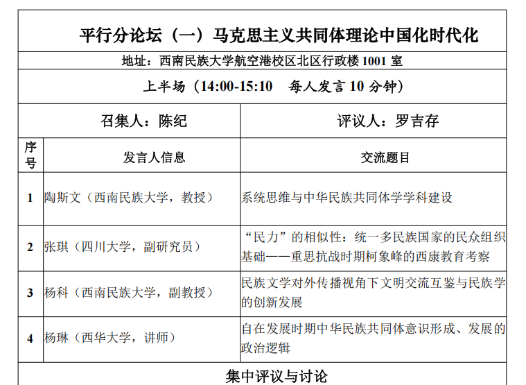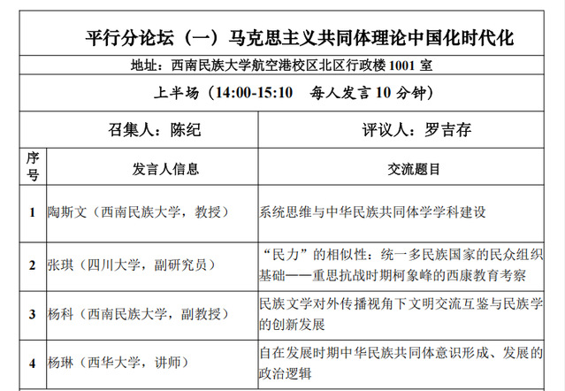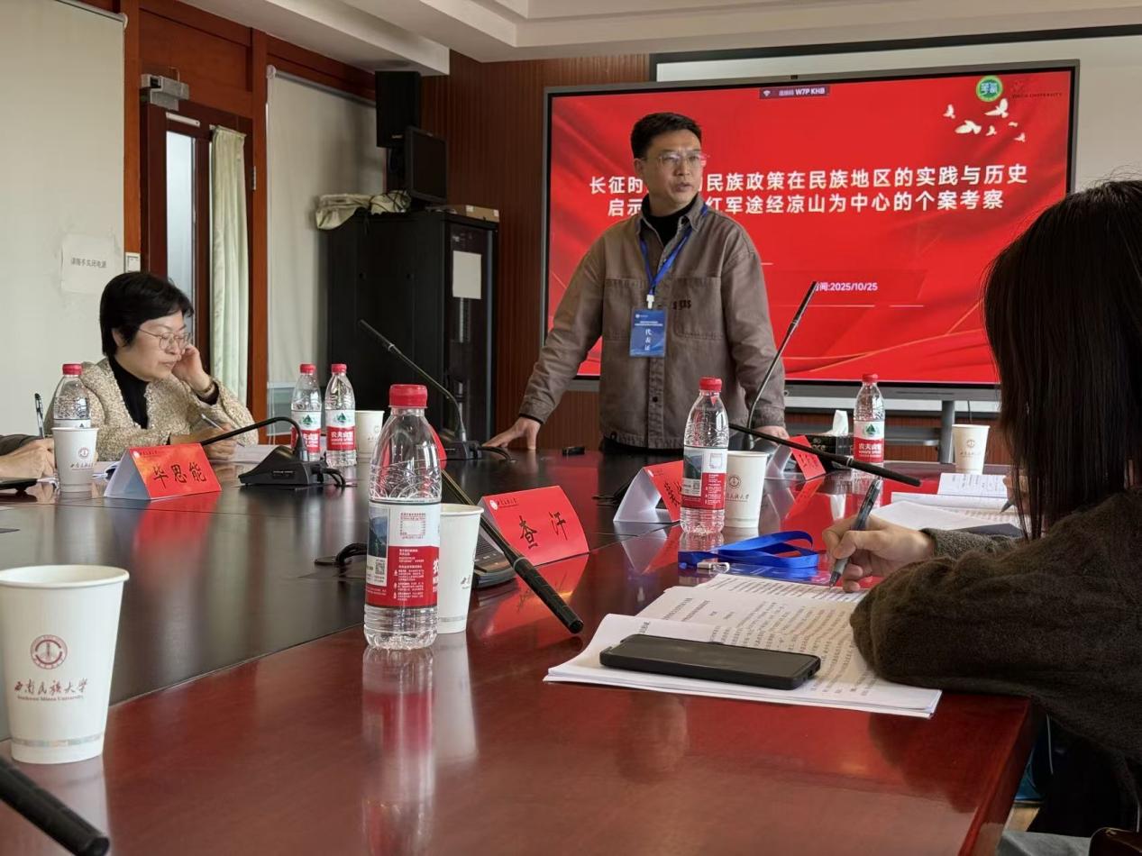 下午为平行分论坛研讨会。会议共设立七个分论坛,分别围绕“马克思主义共同体理论中国化时代化”“中华优秀传统文化的传承与发展”“民族交往交流交融的历史脉络与文化互动”“民族团结进步立法与基层社会治理”等议题展开交流研讨。我院王友富教授与2024级研究生盛文琴、2025级研究生郑姣姣在“中华优秀传统文化的传承与发展”论坛就共同撰写的《长征时期党的民族政策在民族地区的实践与历史启示——以红军途经凉山为中心的个案考察》一文进行交流,以长征时期党和红军在凉山地区的民族政策的实践及其历史启示展开分享。我院教师杨琳博士在“马克思主义共同体理论中国化时代化”论坛就撰写的《自在发展时期中华民族共同体意识形成、发展的政治逻辑》一文进行分享,围绕在中华民族自在发展时期,中华民族共同体意识形成、发展的政治逻辑展开交流。
