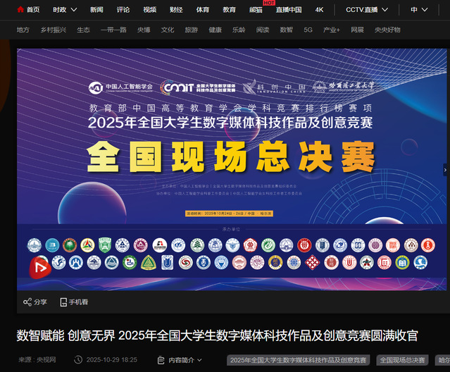 2025年10月29日,央视网以“数智赋能 创意无界 2025年全国大学生数字媒体科技作品及创意竞赛圆满收官”为题,对本次赛事作了报道。