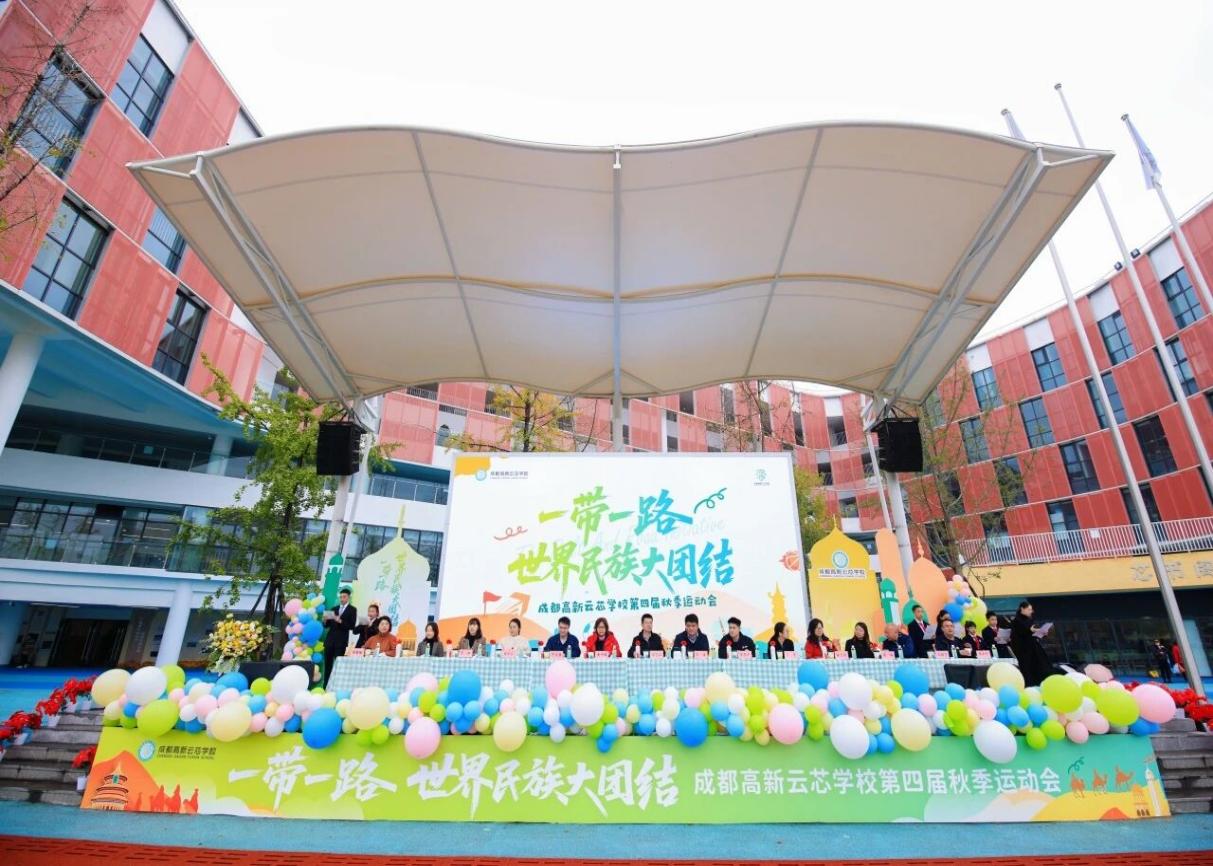 10月31日,成都高新云芯学校以“一带一路·世界民族大团结”为主题的第四届秋季运动会盛大开幕。bevictor伟德,伟德bv国际体育7名学生代表在学院教师王雪峤、梁玲云的带领下,携手该校师生,通过精彩的文艺表演为开幕式助力,用青春活力点燃现场氛围。