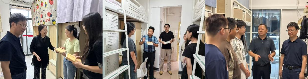 9月11日下午,学院党委书记万远英、院长冯永泰、党委副书记石元鹏、副院长尹德志、副院长王贝、学工办主任杜靖及新生辅导员钟兴悦共同走访了本科生和研究生寝室。走访中,学院领导与新生亲切交流,细致询问他们的生活安顿情况,并针对不同阶段学生提出殷切期望:鼓励研究生珍惜时光、深耕学术、潜心科研;勉励本科新生积极适应、做好规划、全面提升自我。学院还为每间新生寝室赠送了《习近平著作选读》第一二卷,希望同学们读原著、学原文、悟原理,坚定理想信念,夯实理论根基。