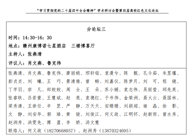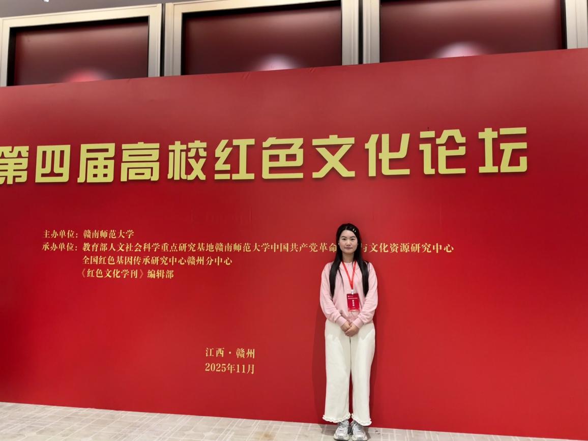 11月23日,由赣南师范大学主办、教育部人文社会科学重点研究基地赣南师范大学中国共产党革命精神与文化资源研究中心、瑞金中央革命根据地纪念馆——赣南师范大学江西省革命文物协同研究中心等单位承办的“学习贯彻党的二十届四中全会精神”学术研讨会暨第四届高校红色文化论坛在赣州康博诺七星酒店举行。来自复旦大学、中国人民大学、上海大学、南昌大学、浙江理工大学等高校、党校系统的专家学者、硕博士研究生参加研讨会。bevictor伟德,伟德bv国际体育2025级研究生郑姣姣受邀参会。
