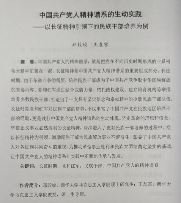 下午为平行分论坛研讨会。会议共设立三个分论坛,围绕“红色文化”的相关议题展开交流研讨。我院2025级研究生郑姣姣在分论坛三就其导师王友富教授的指导下撰写的《中国共产党人精神谱系的生动实践——以长征精神引领下的民族干部培养为例》一文进行交流,以长征文化是红色文化的核心组成部分,长征精神是中国共产党人精神谱系的重要组成部分,就长征精神在民族干部培养中的实践逻辑展开分享。