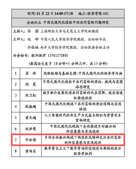 下午为平行分论坛研讨会。会议共设置8个分论坛,分别围绕“马克思主义政治经济学经典著作文本研究”“马克思主义经济思想史与当代资本主义批判研究”“习近平经济思想与中国自主经济学知识体系研究”“新质生产力和新型生产关系研究”“中国式现代化进程中的共同富裕问题研究”“经济高质量发展与建设现代化产业体系研究”“数字经济前沿问题的政治经济学研究”“构建高水平社会主义市场经济体制和推进高水平对外开放研究”展开专题研讨。我院2023级研究生牛冰倩撰写的论文《乡村全面振兴视域下构筑农民精神生活共同富裕的价值意蕴与实践进路》在“中国式现代化进程中的共同富裕问题研究”论坛进行发言,论文系统剖析了当前农村精神文明建设虽取得成效,但仍面临城乡文化供给不均、组织人才薄弱及农民认识偏差等挑战,提出通过文化事业与产业“双轮驱动”、价值导向“核心引领”、组织与人才“双重保障”和农民主体“活力激发”等多维路径,推动农民物质与精神生活“双富裕”,助力乡村全面振兴。