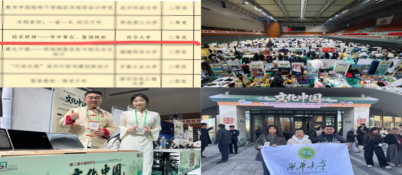 同期,由教育部学位管理与研究生教育司指导,中国学位与研究生教育学会、中国科协青少年科技中心联合主办,天津师范大学承办的第二届中国研究生“文化中国”两创大赛全国总决赛在天津师范大学成功举行。作为全国研究生文化创新领域的重要赛事,本届大赛以推动中华优秀传统文化创造性转化、创新性发展为核心,吸引了来自全国 443 所高校的 5398 支队伍、13459 名研究生踊跃参与,竞争激烈。经过层层选拔与严格评审,我院 “鹃承耕澜队” 凭借兼具文化深度与创新活力的优秀作品脱颖而出,成功跻身全国总决赛,与来自96所高校的283支队伍、876名选手同台竞技。最终,团队在激烈角逐与深度文化交流中展现出扎实的文化功底和创新思维,荣获全国二等奖。