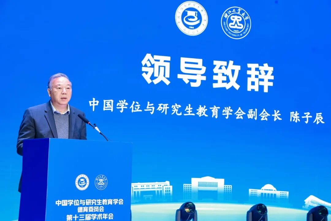 在会议致辞阶段。中国学位与研究生教育学会副会长陈子辰指出,要深刻认识研究生教育在强国建设中的历史使命,统筹推进教育、科技、人才一体化发展,构建研究生育人新业态。中国科学院院士、北京科技大学副校长吕昭平代表秘书处单位表示,学会将坚持立德树人,继续搭建多维平台,优化运行机制,助力研究生教育事业发展。浙江工业大学党委副书记吴巨慧介绍了浙工大构建“德育、学术、发展、文化”四个共同体的研究生思政体系,以及推动思政教育与专业科研深度融合的经验。