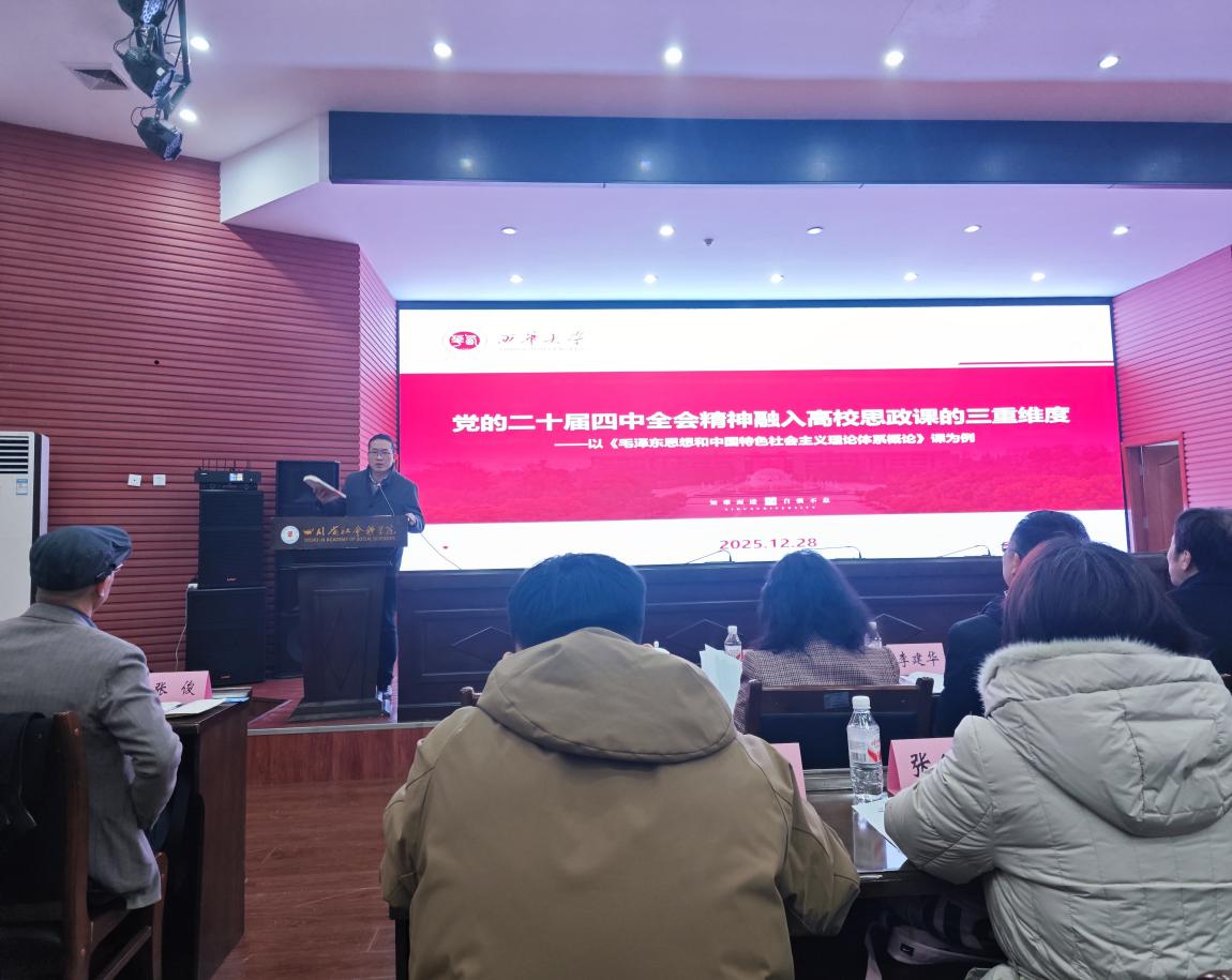 第二阶段议程为学术研讨,由四川省社会科学院伟德bv国际体育副院长赵小波主持。四川省社会科学院院长杨颖围绕“毛泽东社会主义现代化战略思想”行主题发言。中共四川省委党校党建教研部的梁晓宇、四川大学伟德bv国际体育院长李建华、西南交通大学伟德bv国际体育副院长谢瑜、西南财经大学伟德bv国际体育胡建教授、西南石油大学伟德bv国际体育党委书记林莉、西南民族大学伟德bv国际体育副院长高乃云、成都医学院伟德bv国际体育院长张俊、四川旅游学院伟德bv国际体育党委副书记李秀铎、乐山学院伟德bv国际体育副院长赖伟等分别围绕相关主题作了学术分享。我院《毛泽东思想和中国特色社会主义理论体系概论》教研室主任李扬扬以“党的二十届四中全会精神融入高校思政课的三重维度——以《毛泽东思想和中国特色社会主义理论体系概论》课为例”为题,进行了主题发言。
