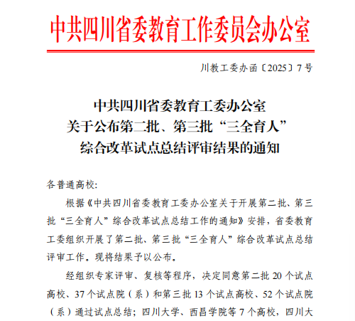 近日,中共四川省委教育工委办公室印发《中共四川省委教育工委办公室关于公布第二批、第三批“三全育人”综合改革试点总结评审结果的通知》,经专家评审、复核等程序,我院作为四川省第三批“三全育人”综合改革试点院(系),顺利通过试点总结验收。