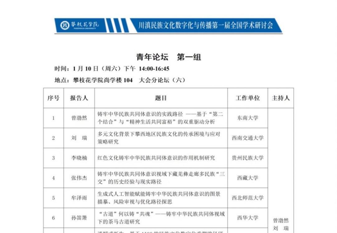 2026年1月10日,由四川省社会科学界联合会与攀枝花学院联合主办,学校川滇民族文化数字化与传播重点实验室承办的铸牢中华民族共同体意识暨川滇民族文化数字化与传播第一届全国学术研讨会在攀枝花学院隆重召开。来自全国47所高校及科研院所的100余位专家学者齐聚花城,围绕铸牢中华民族共同体意识及民族文化数字化与传播等议题展开深入交流。我院2024级马克思主义理论专业研究生孙笛箫受邀参会并在分论坛汇报发言。