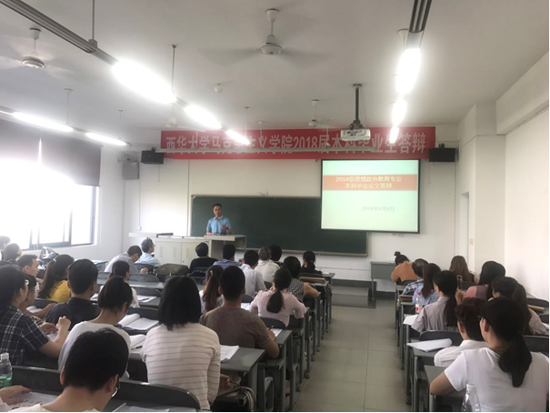 6月6日上午8:30,马克思主义学院隆重举行2018届本科毕业论文答辩。按照学校本科毕业论文答辩规则的要求,思想政治教育专业56名毕业生中,有4名学生参加了学院组织的集中答辩,其余52名学生分为两个小组参加分组答辩。答辩过程包括指导教师介绍学生论文(2分钟)、学生陈述(5分钟)、教师提问、学生回答问题、教师点评五个环节。参加答辩的同学大都能够运用所学知识较为准确地回答老师的提问,答辩老师认真听取了每个学生的答辩陈述,对同学们认真、辛苦的论文创作和答辩给予了充分肯定,同时老师们也指出了每位同学毕业论文中涉及格式、结构、文字表达、学术水平等方面的问题。最后答辩老师根据学生在答辩中的报告过程、报告内容和答辩进行了成绩的综合评定。